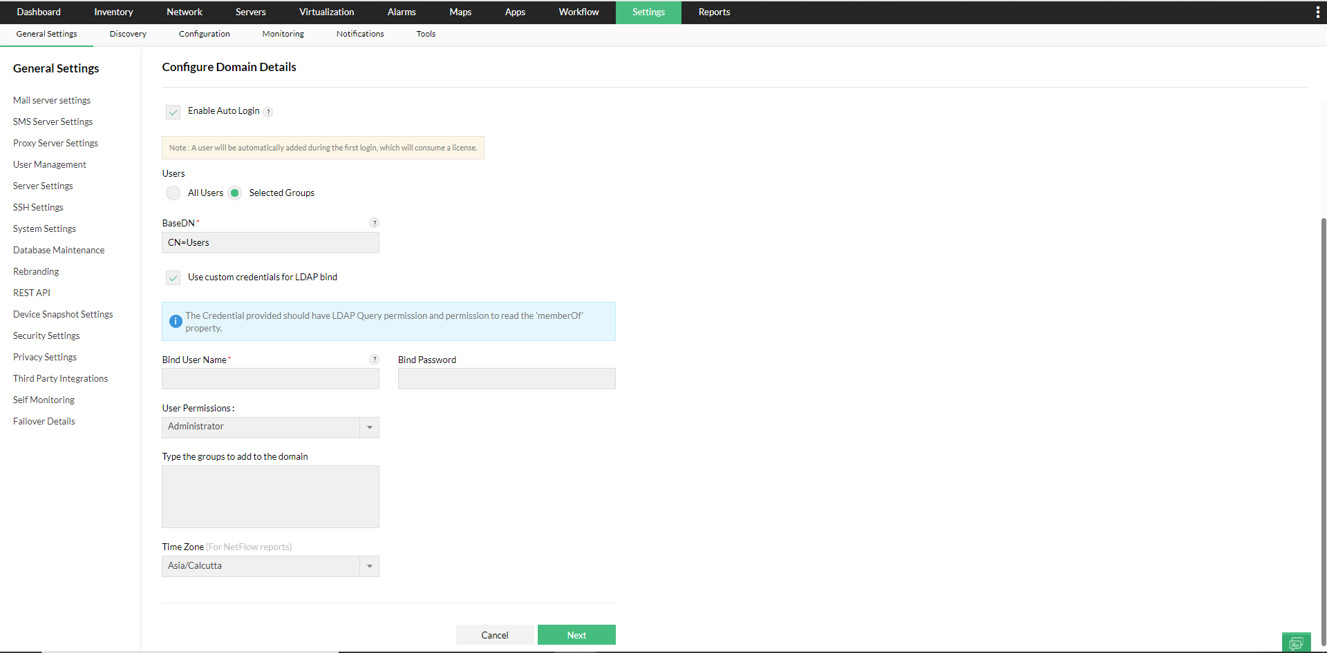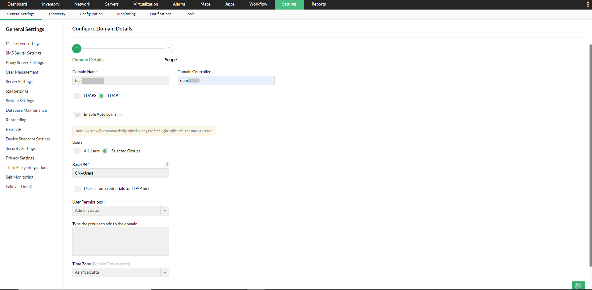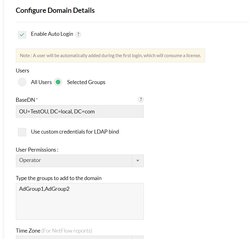 4. 启用自动登录后,选择域的用户和用户权限,根据需要编辑时区,然后单击下一步。在自动登录期间,可以为 AD 用户分配选定的模块和作用域。
