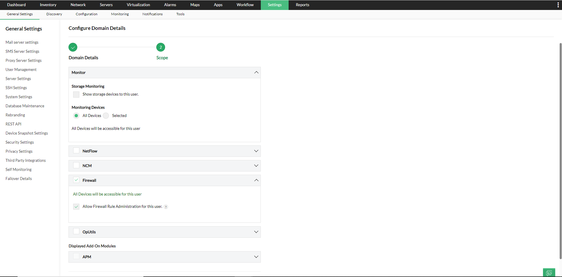 监控 - 您可以向此用户提供对所有设备或仅选定业务视图的访问权限。如果选择所有设备,则用户将有权访问OpManager模块中的所有设备。如果选择了选定的业务视图,则可以使用“全选”选项授予对所有业务视图的访问权,并使用“无标题”选项授予对无标题业务视图的访问权。