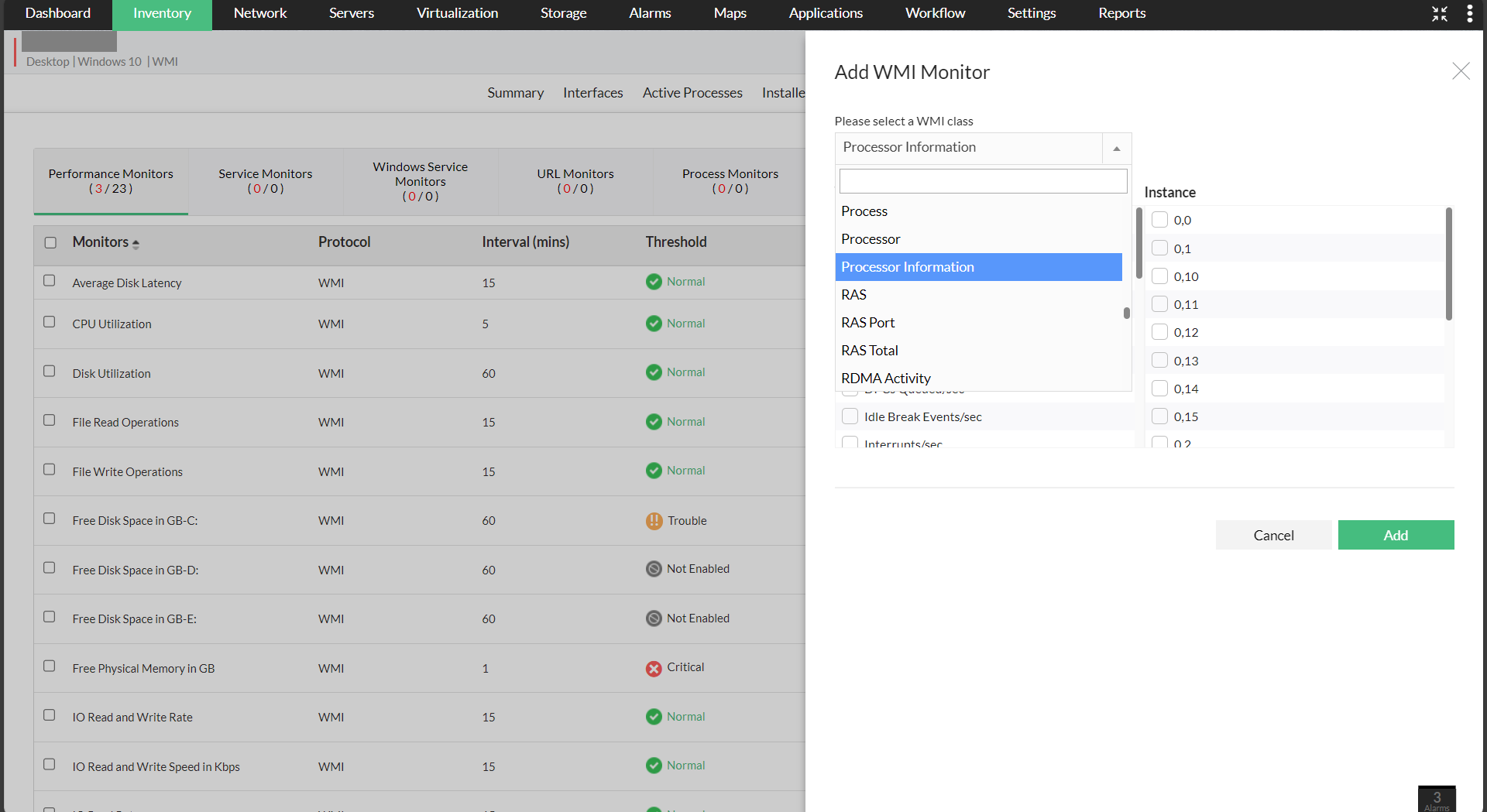 - 您将看到关联的性能监视器列表。现在,单击“操作”下拉列表,然后单击添加WMI监视器选项。
