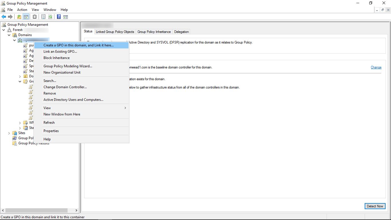 - 打开 GPMC 后,右键单击您的目标组织单位(在我们的示例中为域),然后选择在此域中创建 GPO,并将其链接到此处选项。