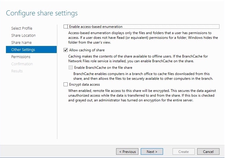 - 在“配置共享设置”向导页上,接受其他设置(允许缓存共享)中的默认选项,然后单击下一步。