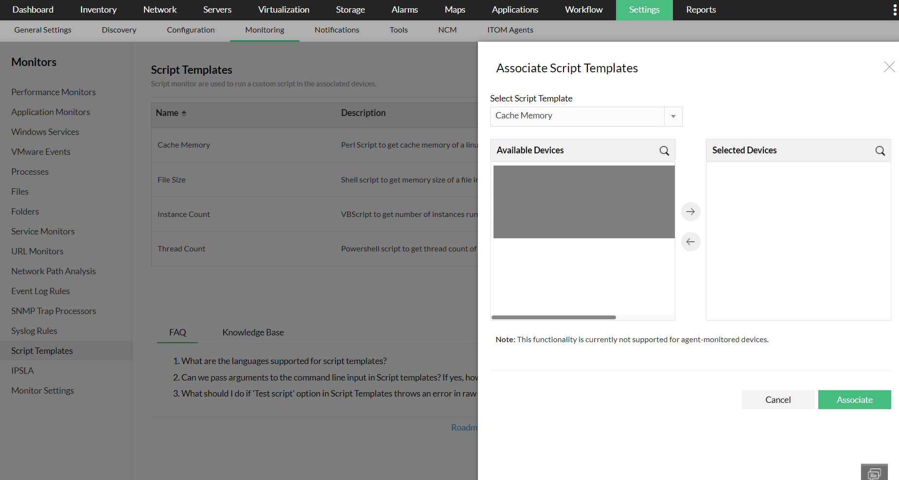 OpManager的脚本监控模板可帮助您创建自定义脚本来监控自定义参数。这有助于检索特定于您的需求的数据,并允许您自定义监视工作。单击此处了解如何在OpManager中添加脚本模板。