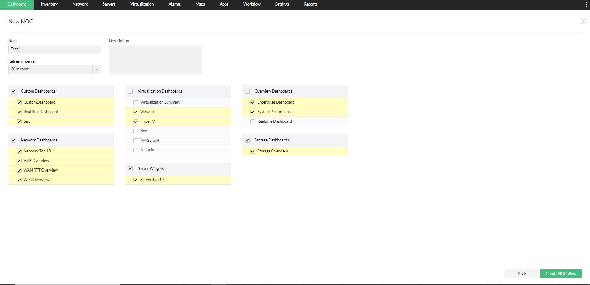 - 选择要包含在此 NOC 视图中的所需仪表板。