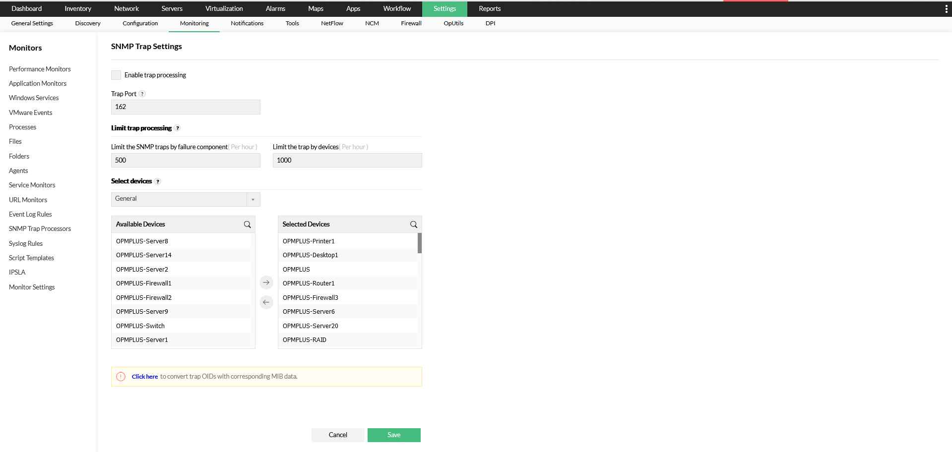 要更新端口162的端口号,请转到OpManager UI中的设置->监视->SNMP陷阱处理器->陷阱设置。