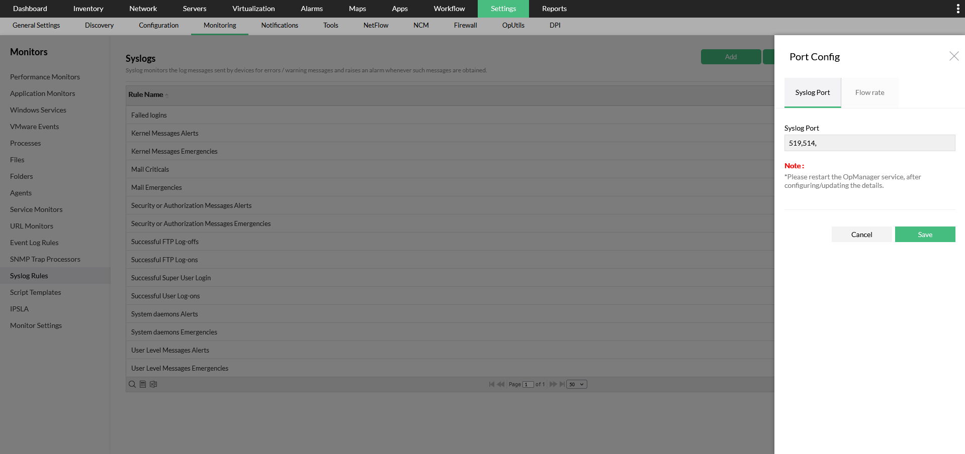 要在OpManager中更新端口514,请转到“设置->监视->系统日志规则->系统日志端口”,然后更改端口号。