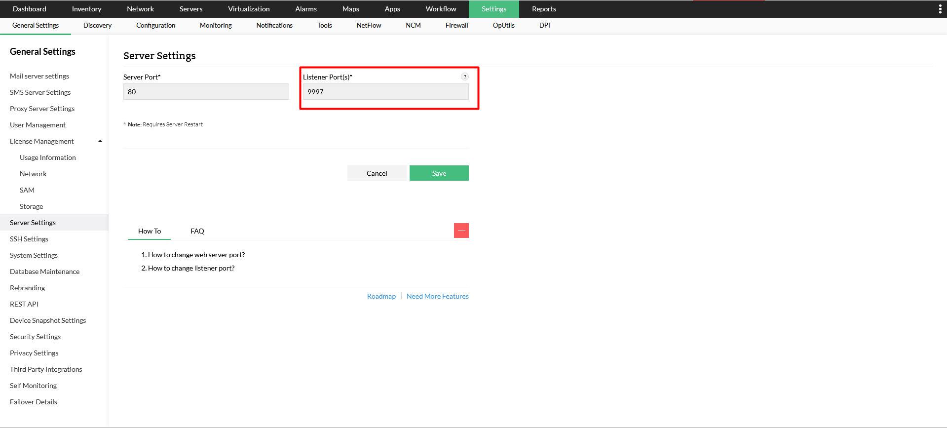 要更新特定于NCM附加模块的端口514,请转到OpManager UI中的设置 -> NCM -> 服务器设置,然后更改“Syslog Server”下的端口号。
