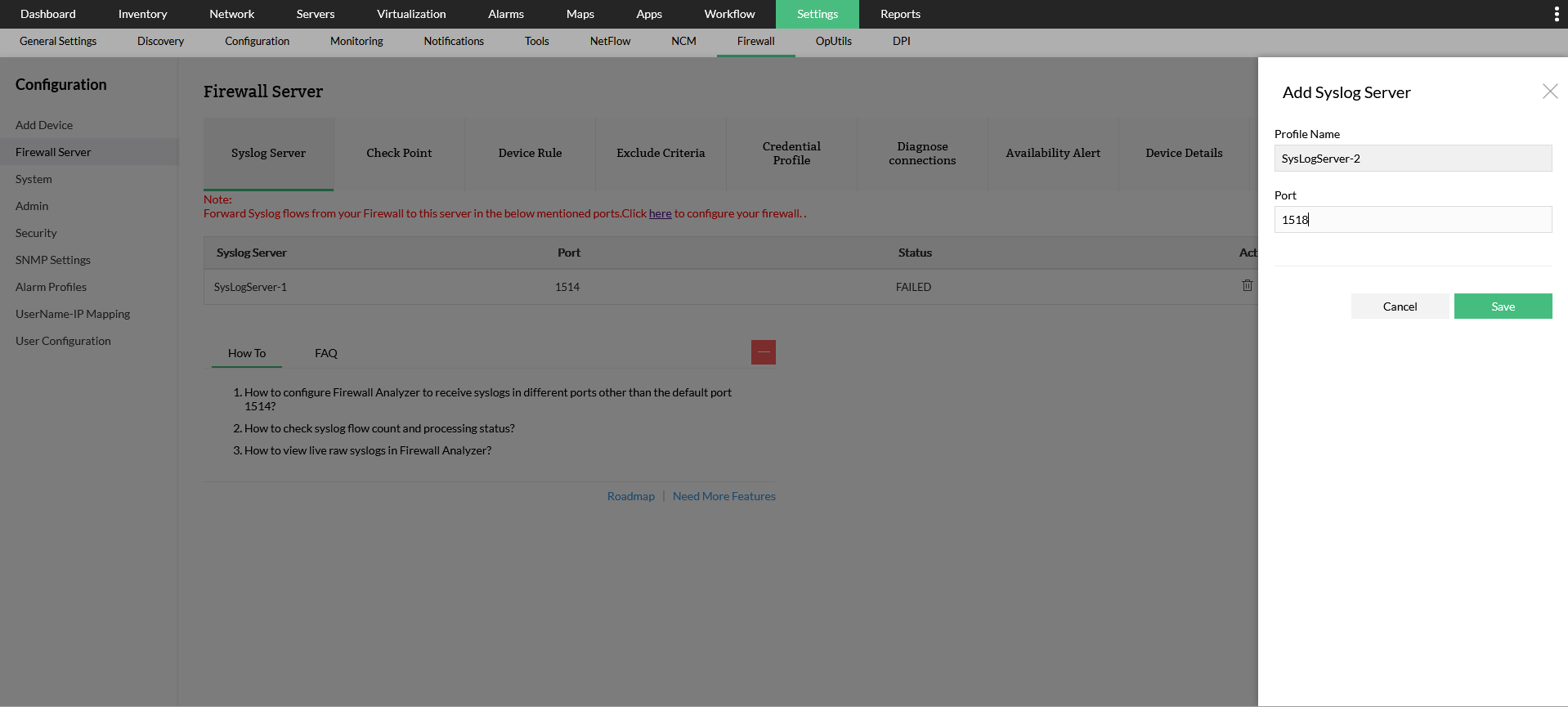 要更改此端口,请转到“设置->防火墙->系统日志服务器->添加并添加新的虚拟系统日志服务器,然后开始在新端口上侦听导出的日志文件。(仅适用于 Firewall Analyzer 附加模块)