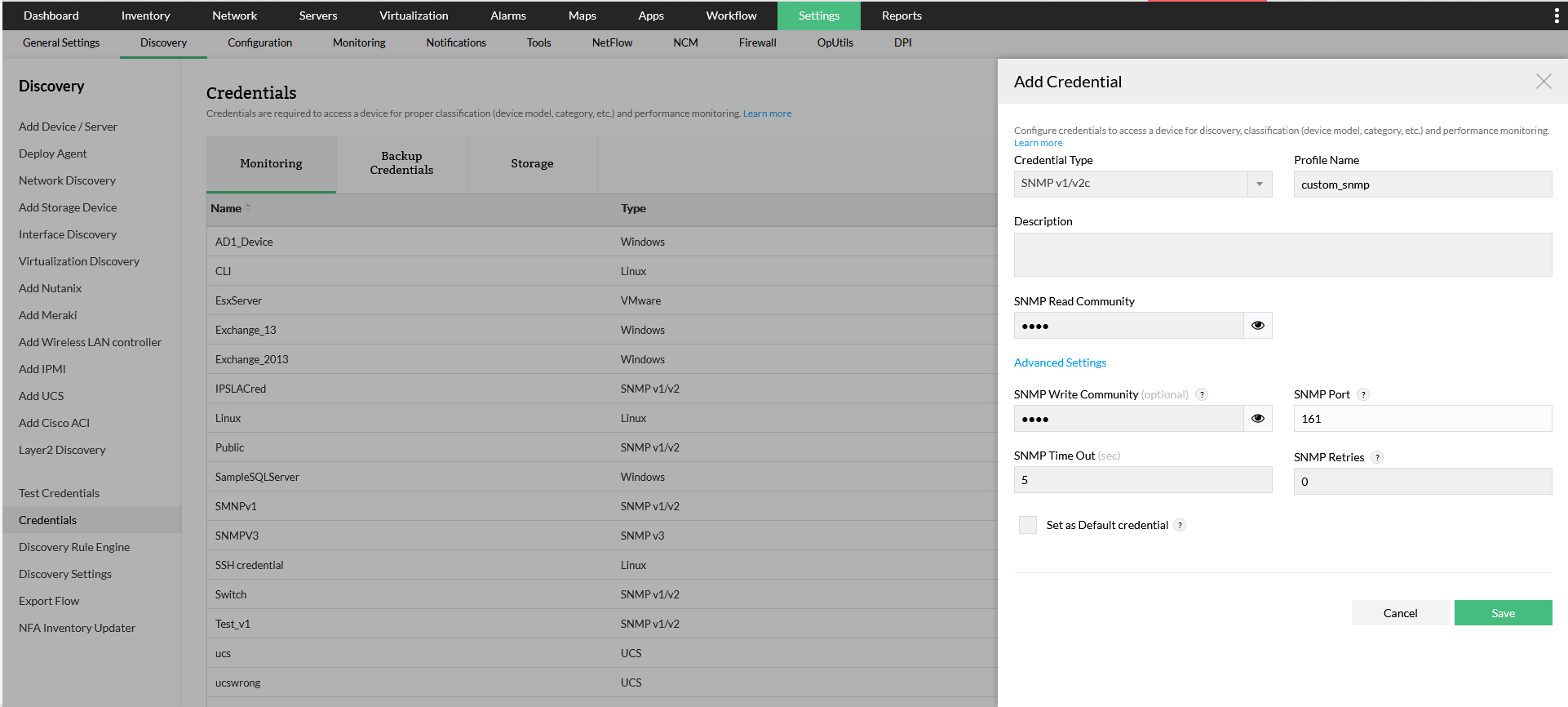 如果要配置其他SNMP端口,请在OpManager UI的“凭据”页面(“设置->发现->设备凭据”)中进行配置。
