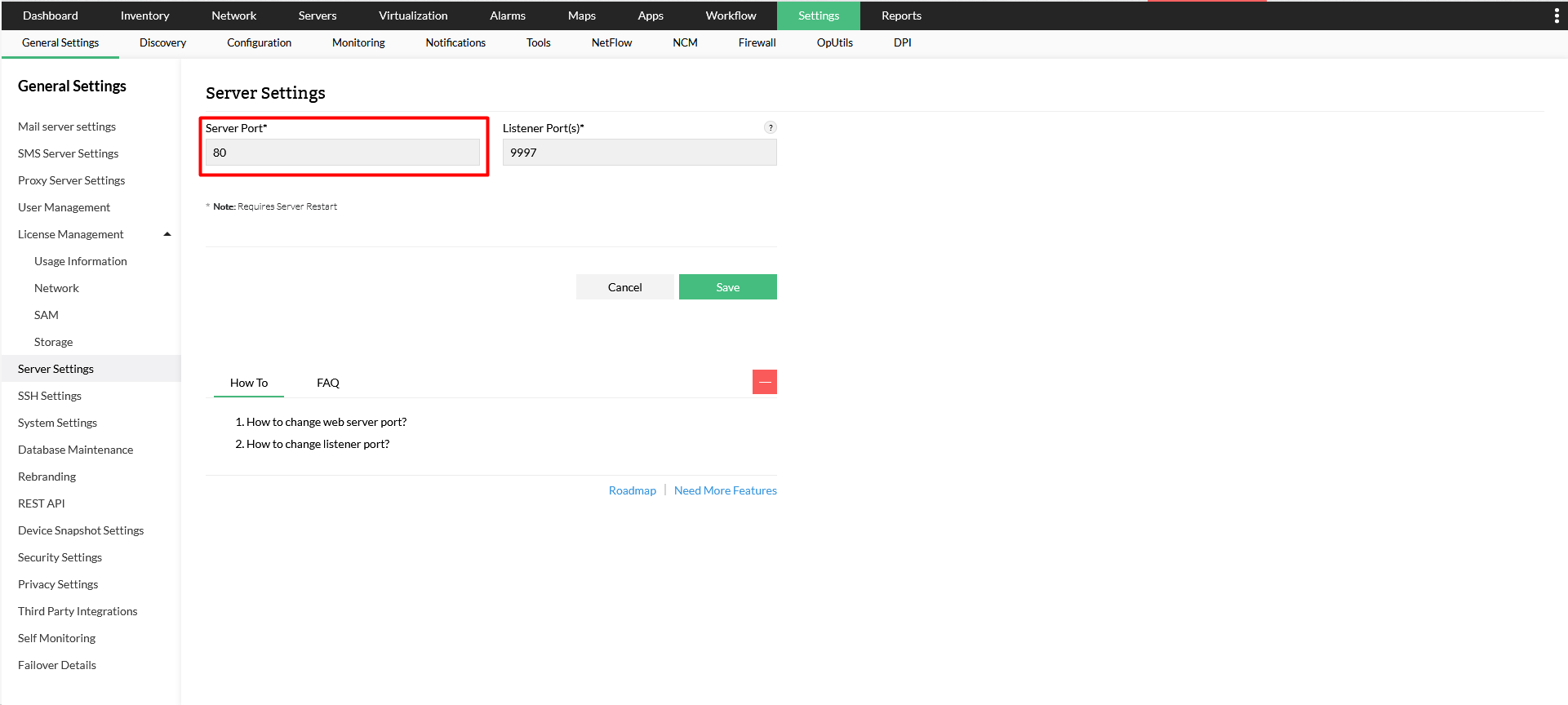 要在OpManager UI中更改此端口,请转到“设置->常规设置-服务器设置”>并更改“服务器端口”。