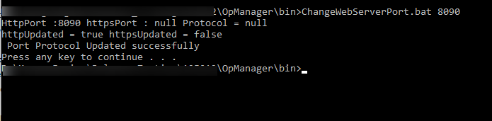 若要更改此端口,请转到 <OPM_Installation_Directory>\bin 并打开ChangeWebServerPort.bat文件。打开后,执行ChangeWebServerPort.bat <新端口号>命令,其中必须输入新的所需端口号来代替<新端口号>。