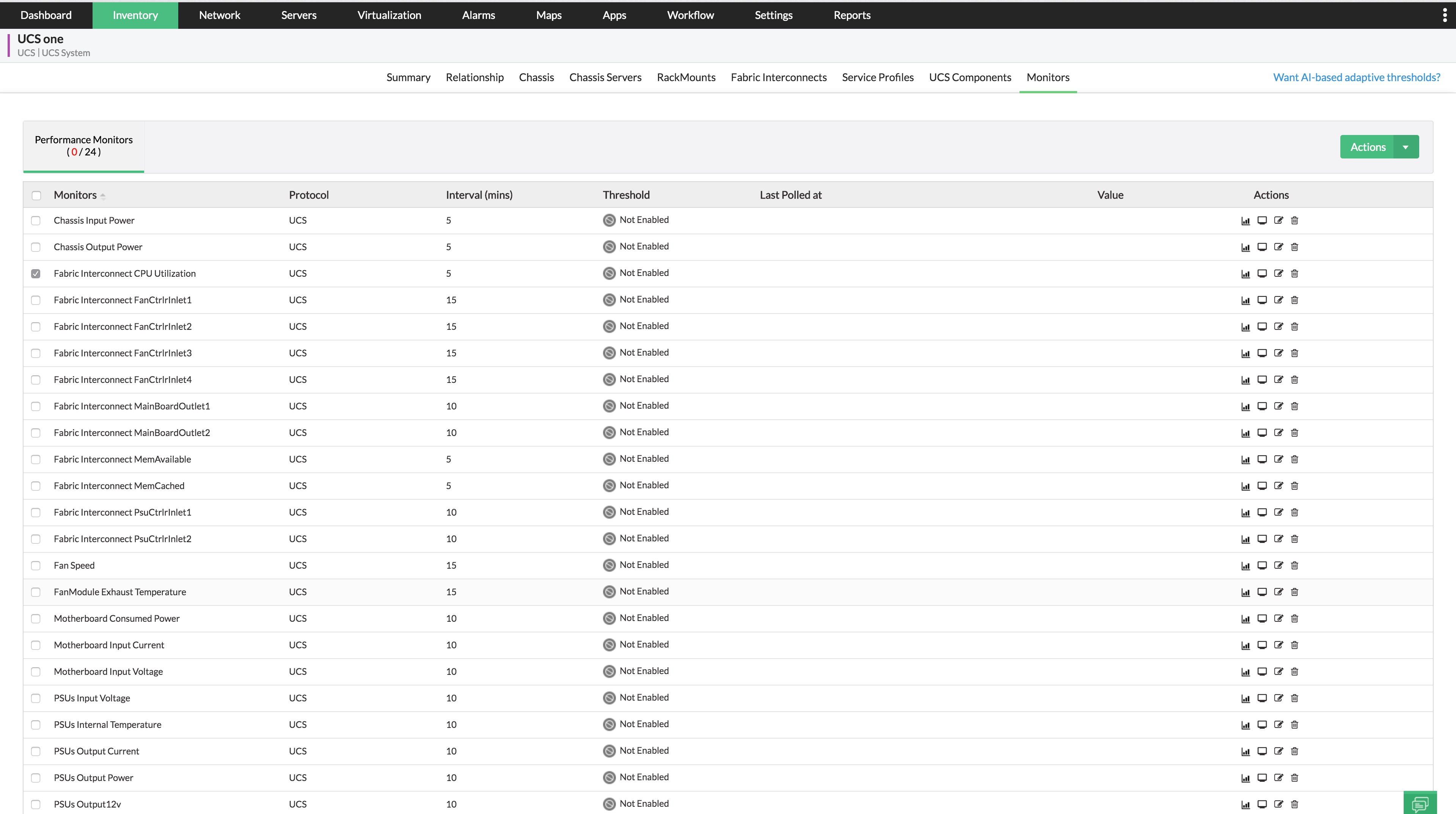 每当OpManager发现UCS设备时,UCS性能监视器都会自动与之关联。可以设置阈值以在违反时接收告警。