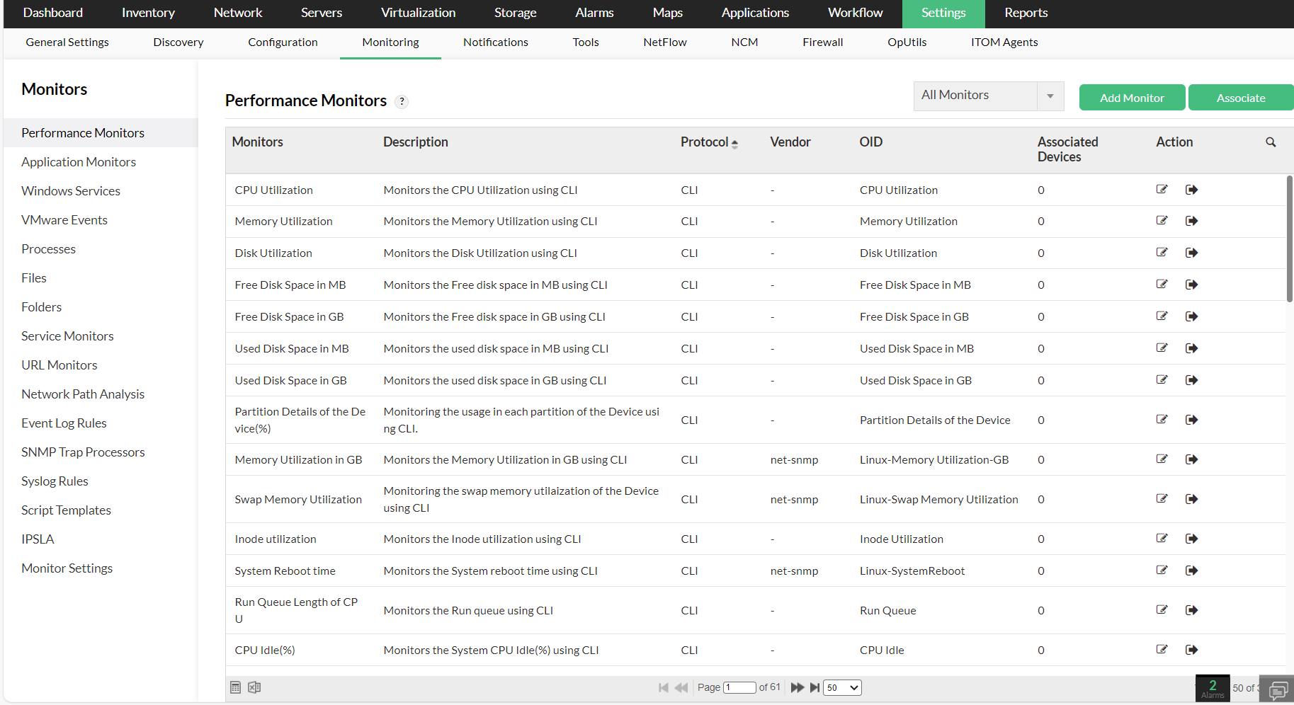 - 要将监视器与设备关联,请转到相应的监视器,然后单击操作列下的关联按钮。您也可以单击右上角的关联选项,然后在后续步骤中选择监视器和设备以将监视器与设备关联。