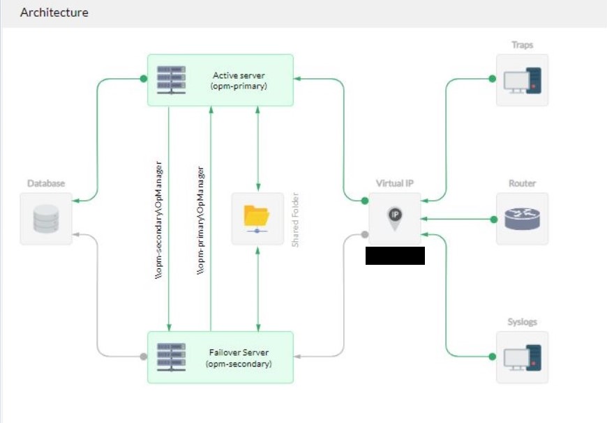 - 具有虚拟 IP 地址:虚拟 IP 地址是同一子网上的主服务器和辅助服务器共享的通用 IP 地址。当一台服务器出现故障时,虚拟 IP 将指向另一台服务器。(此功能仅适用于OpManager版本12.5.140及更高版本。