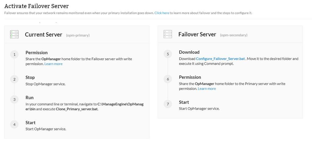 故障转移是一种备用监视实例,用于确保即使主监视设置关闭,网络仍受到监视。OpManager允许您在单独的服务器上配置辅助监控实例,从而帮助确保对网络的不间断监控。