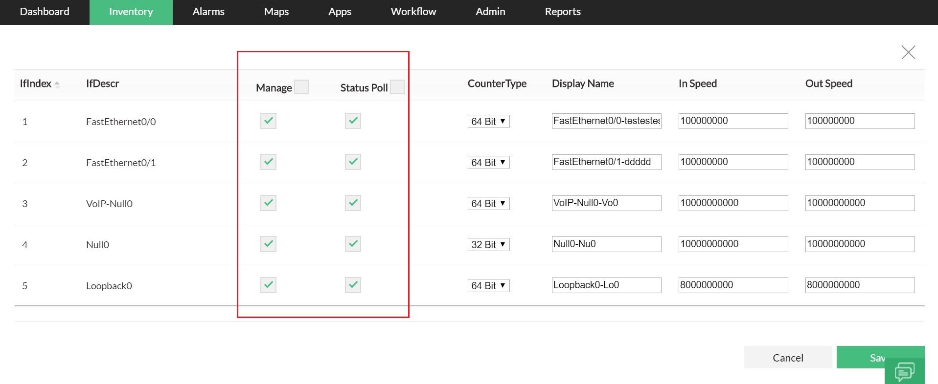 状态轮询:允许/禁止状态轮询以检查接口的可用性 管理:允许/阻止OpManager监控接口的阈值。 如果未选中,则不会监控接口的利用率、错误率和丢包率,并且不会在超过阈值时发出告警。
