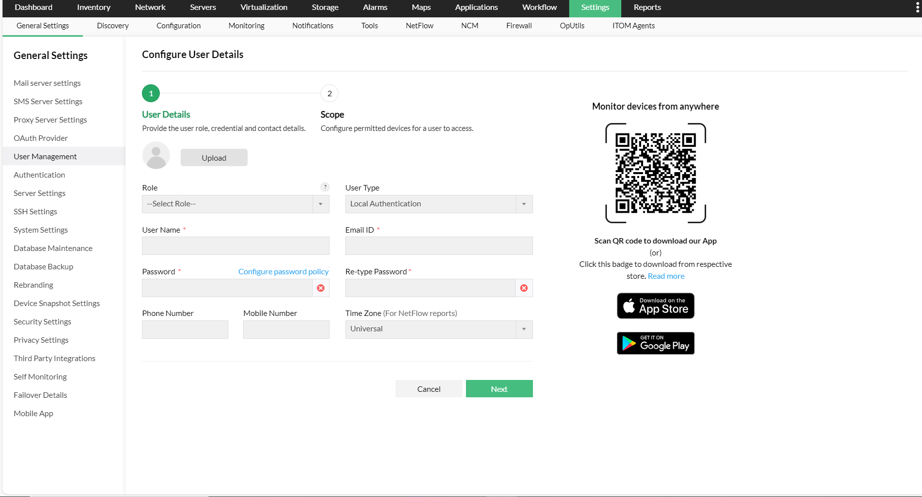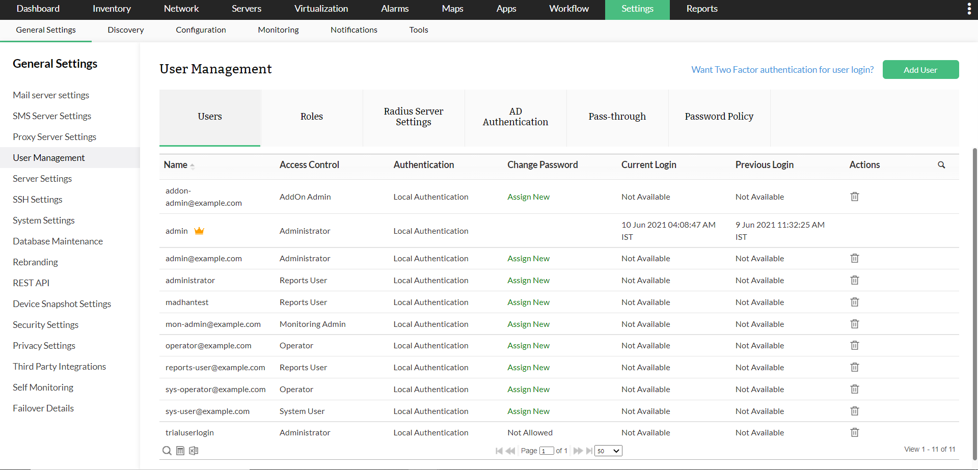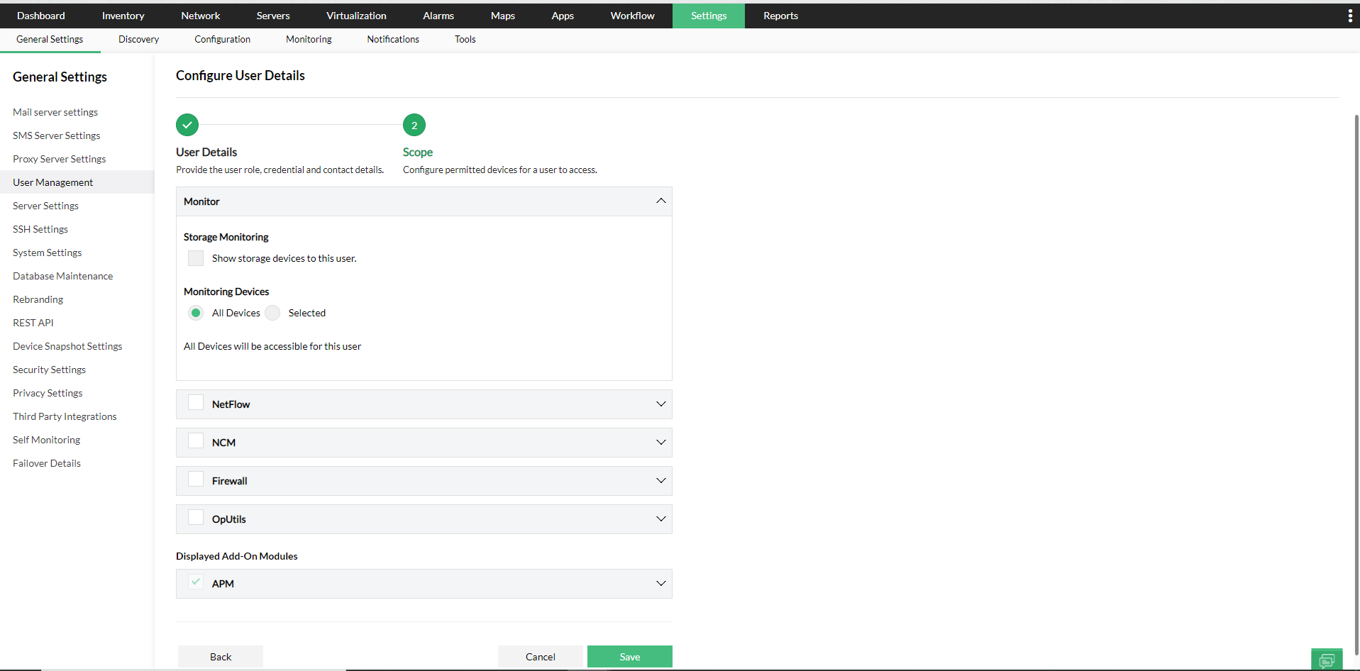 您可以在OpManager中创建用户并为他们提供所需的权限。创建用户的选项仅适用于管理员登录帐户或具有“完全控制”权限的帐户。(此处具有“完全控制”权限的帐户是指有权访问所有启用了所有附加模块的所有设备的管理员用户。
