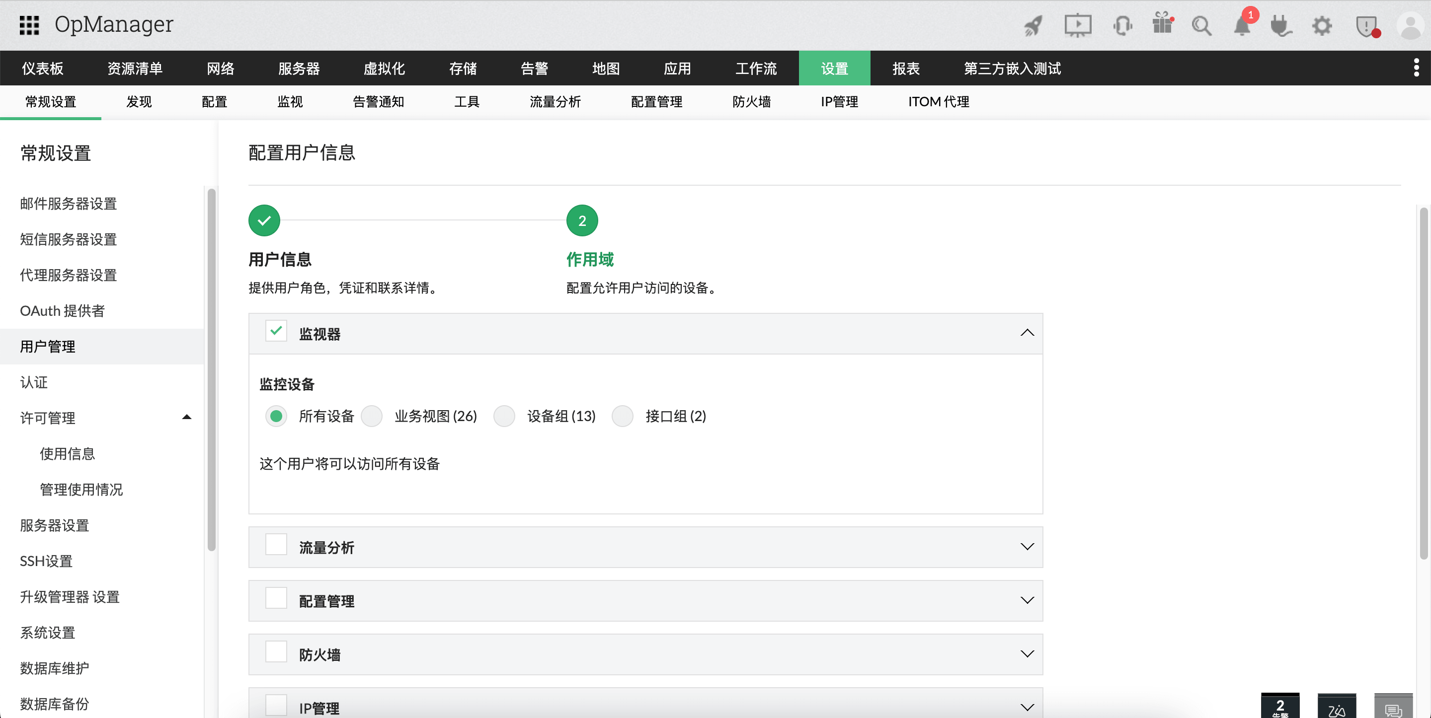监视 - 根据此处选择的选项,将决定该用户在允许访问的附加模块中可访问的设备范围。要进一步了解 OpManager 中用户范围的类型,请点击此处。