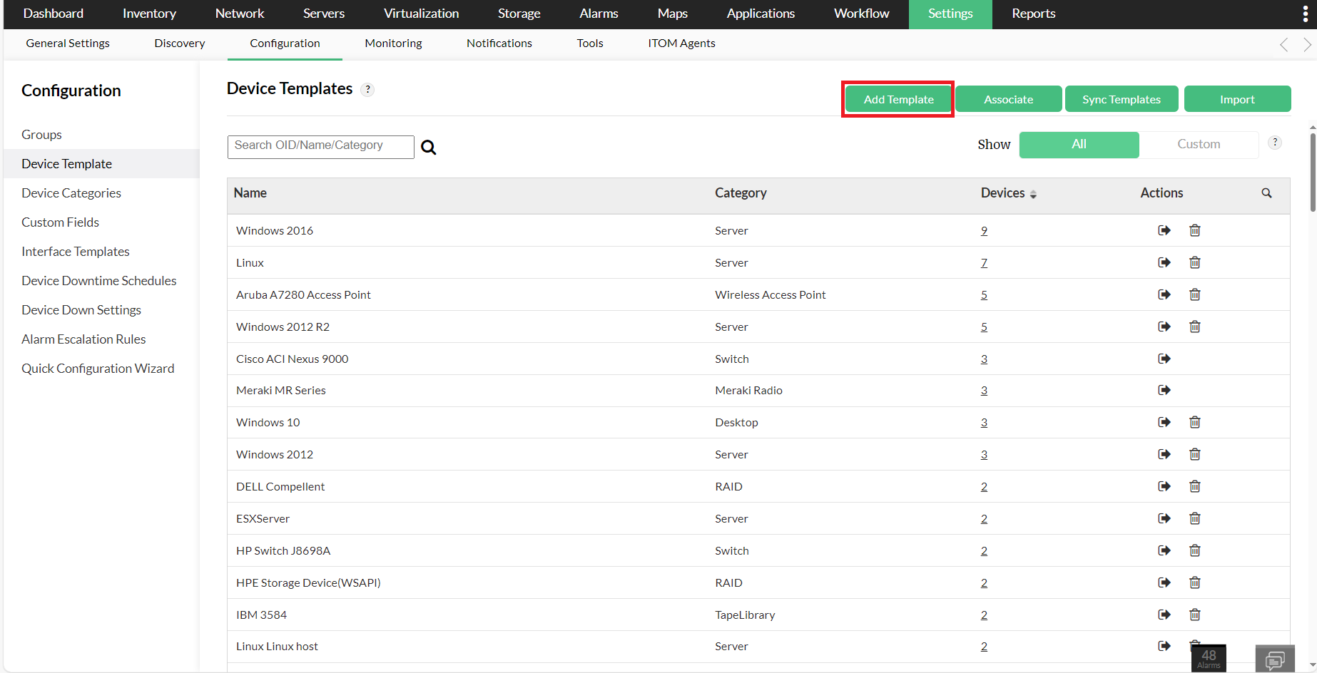 OpManager 内置了 11000+ 设备模板,其中包含用于将设备分类到预定义设备类型的初始配置,从而大大缩短部署时间。不过,你仍可以根据环境需要进一步自定义模板或修改现有模板。