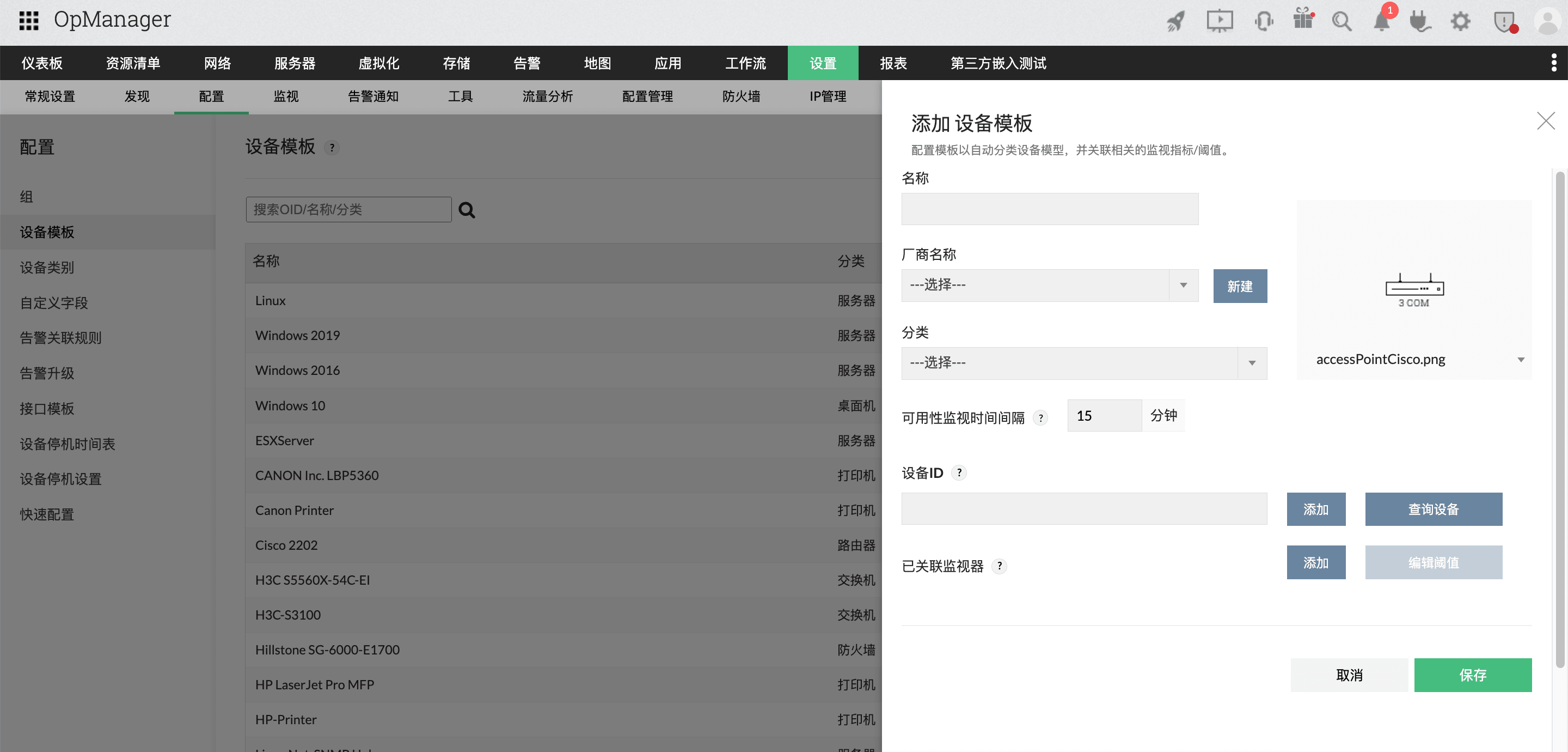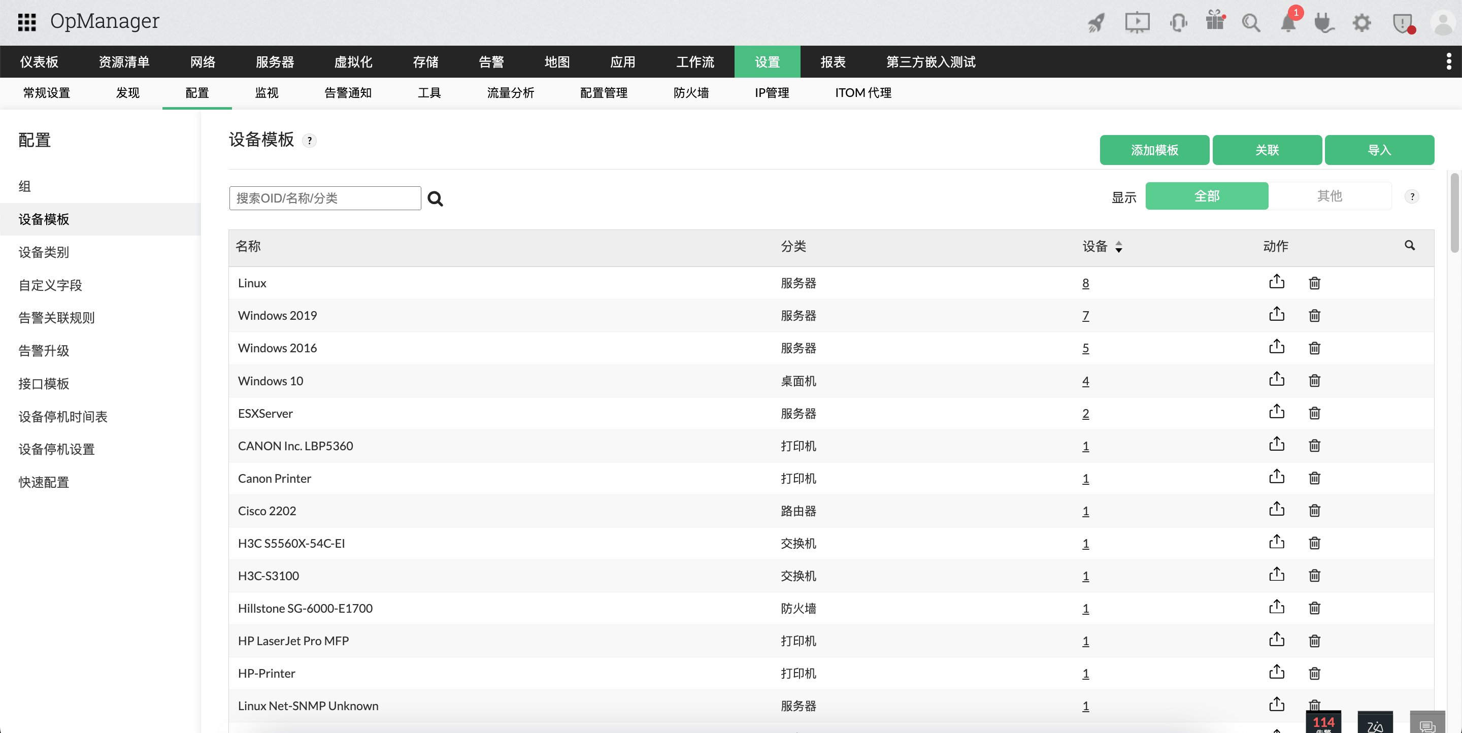 - 设备模板有助于在特定设备类型(设备型号)下自动对设备进行分类,并在设备发现过程中关联必要的性能监视器。
