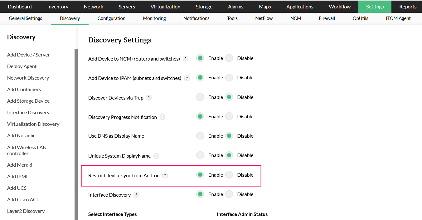 为了解决此问题,在快速配置向导下添加了一个名为发现附加设备的新页面。从附加模块同步的设备将添加到此页面,而不是OpManager清单。除非从加载项页面上的设备列表中手动添加,否则这些设备不会在清单中可用。默认情况下已启用此限制,可以在设置->发现->发现设置->限制来自加载项的设备同步中找到该选项。