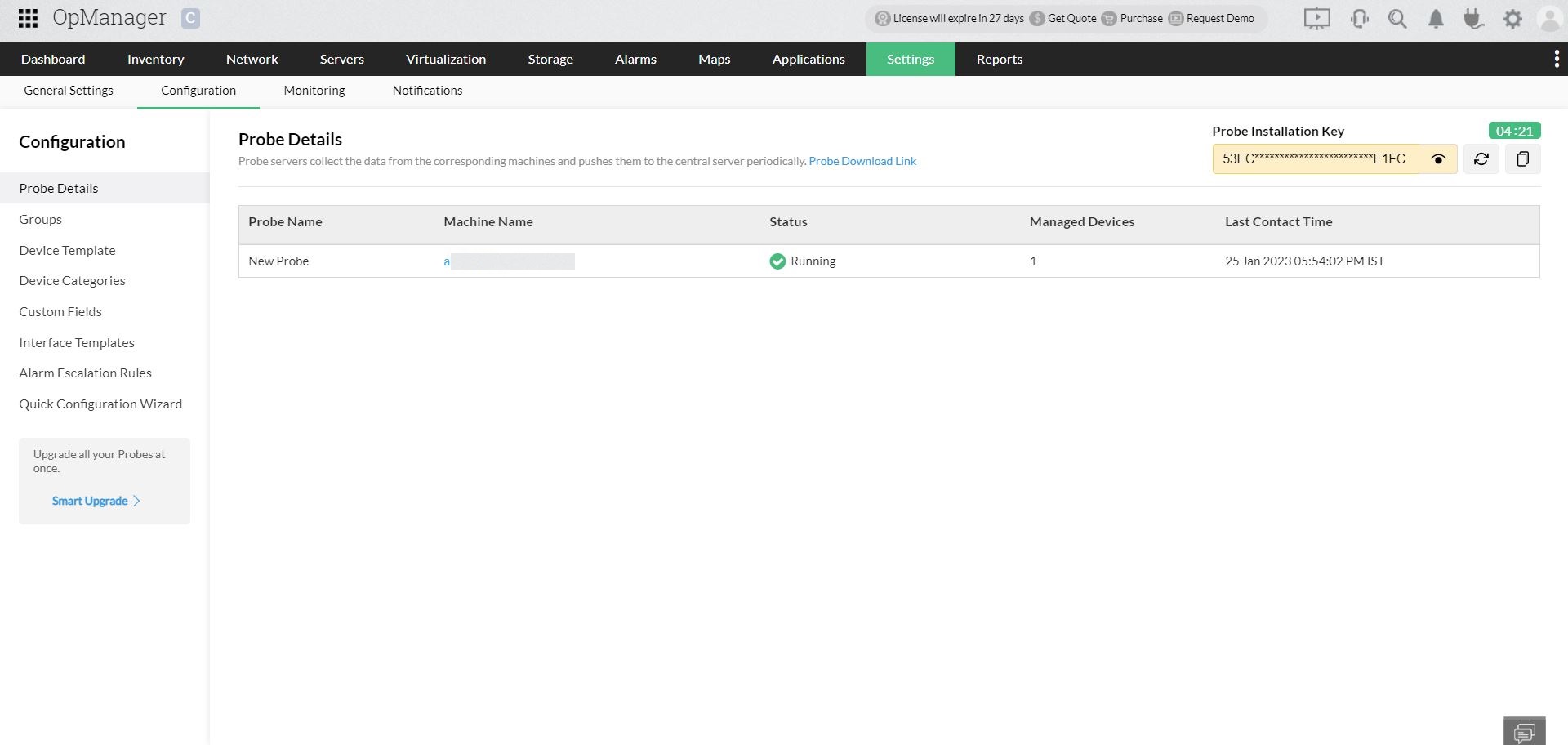 在探针详细信息页面的右上角,您可以找到探针安装密钥。您必须在探针安装过程中输入此密钥。作为安全措施,此密钥将每 15 分钟自动重新生成一次。(您可以使用刷新按钮手动重新生成密钥)。
