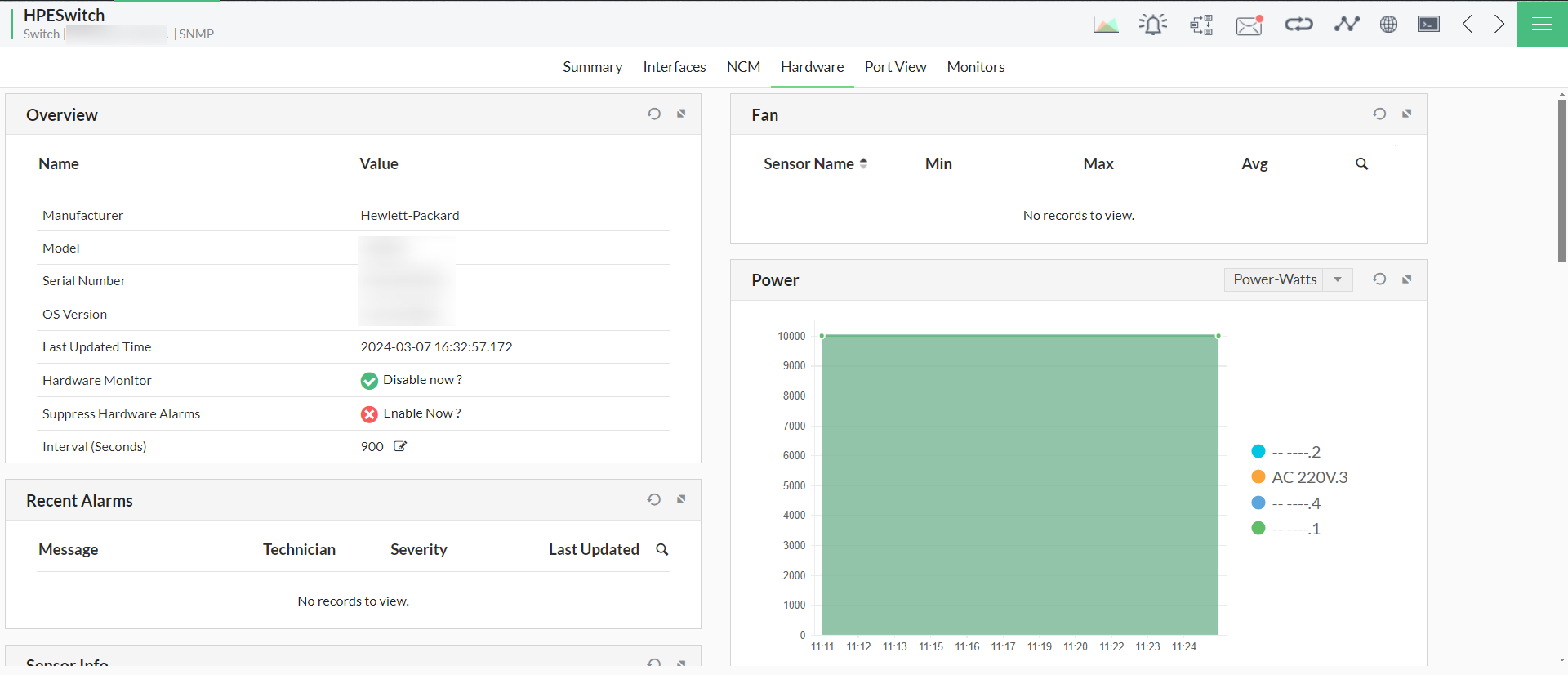 OpManager允许您抑制单个设备的硬件告警。只需转到相应设备的设备快照页面中的“硬件”选项卡,然后单击禁止硬件告警即可关闭该特定设备的硬件告警。