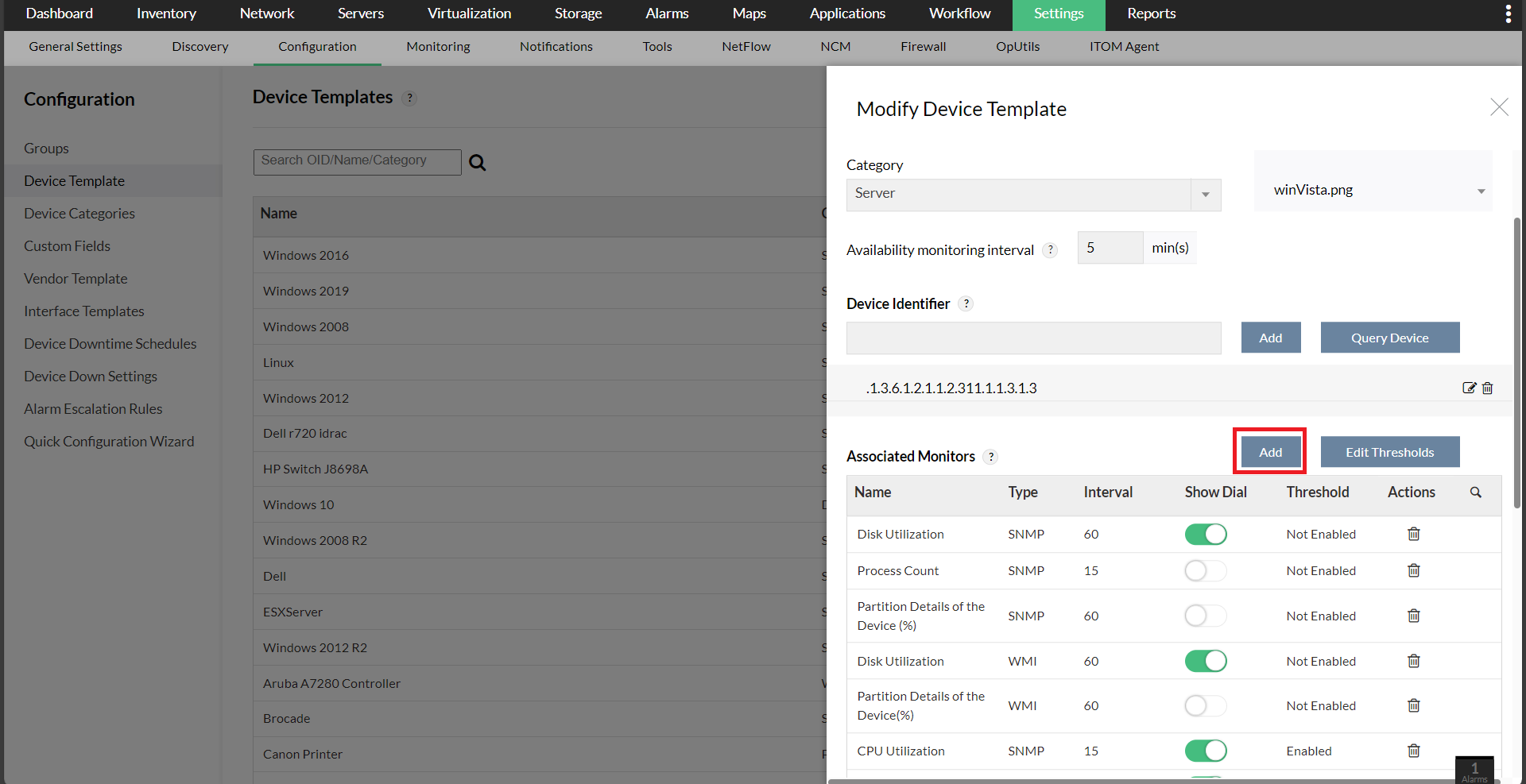 例如,假设您已将基于SNMP的监视器关联到OpManager中服务器类型(例如Linux)的默认模板。因此,从那时起,在OpManager中发现的所有Linux服务器都将默认关联那些基于SNMP的资源监视器。这不仅仅适用于一个设备类别,而且这些定义可用于将相关监视器关联到任何启用了 SNMP 的设备。