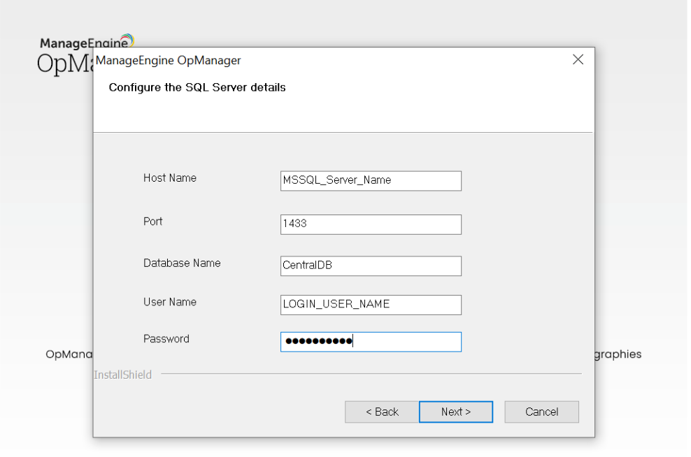 注意:如果OpManager以MSSQL作为后端数据库运行,则必须先配置MSSQL数据库,然后才能进行以下安装。