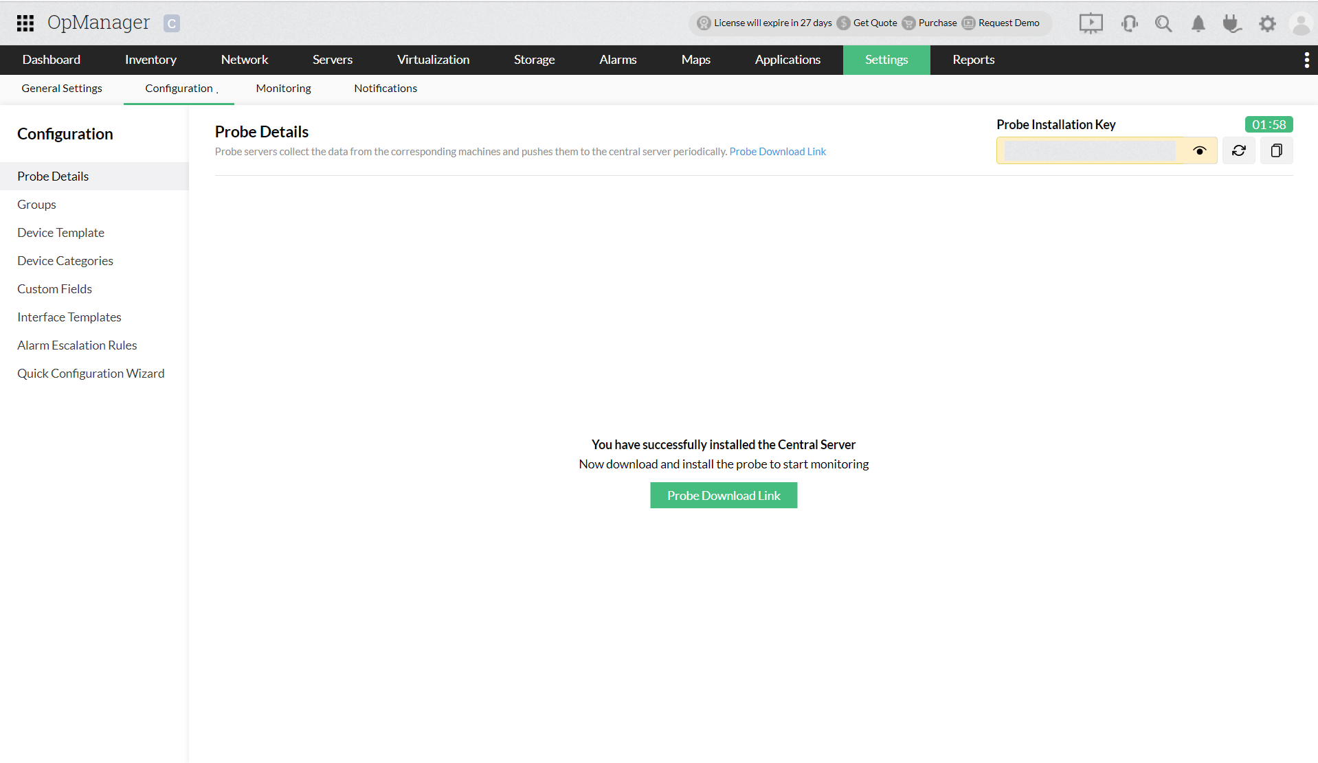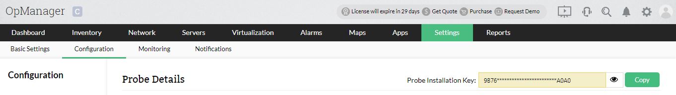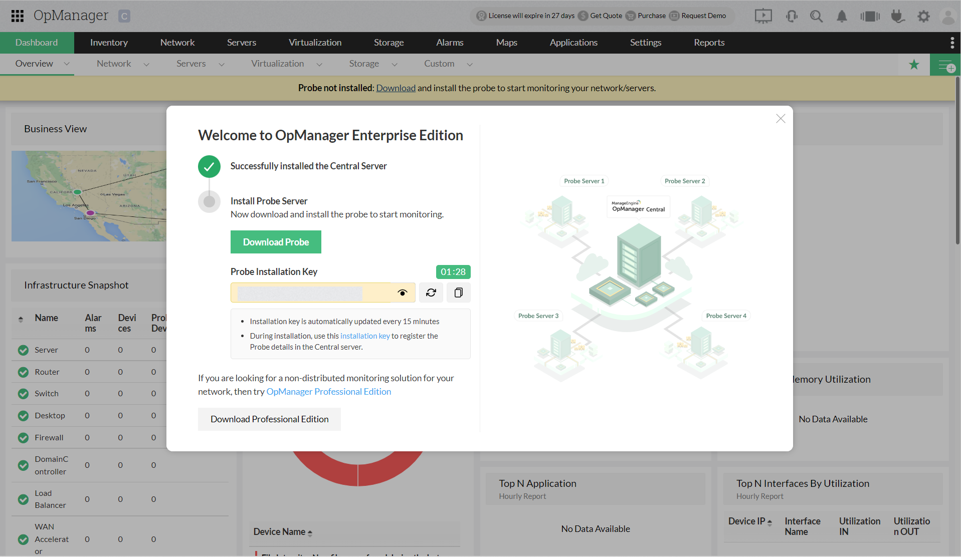 步骤1:从以下链接下载OpManager Probe.exe:下载Probe Server |ManageEngine OpManager(或) 打开OpManager 中心,您将看到一个欢迎通知屏幕,其中包含“探针下载链接”按钮。(探针安装密钥将每 15 分钟自动刷新一次。您也可以使用刷新按钮手动刷新密钥。