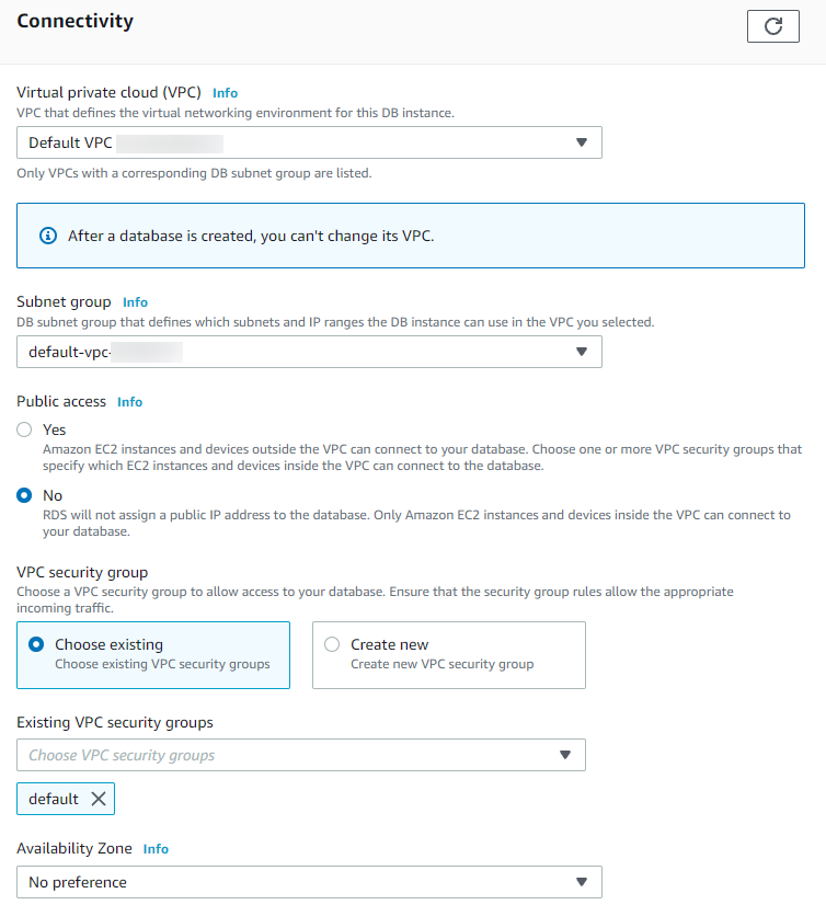 :我们建议在Amazon EC2实例中的另一台服务器上完成OpManager安装,因此必须提供相同的VPC(如果连接是私有的)。此外,请验证安全组是否配置了正确的入站和出站规则(即,MSSQL 实例中使用的端口应在入站规则中打开)。
