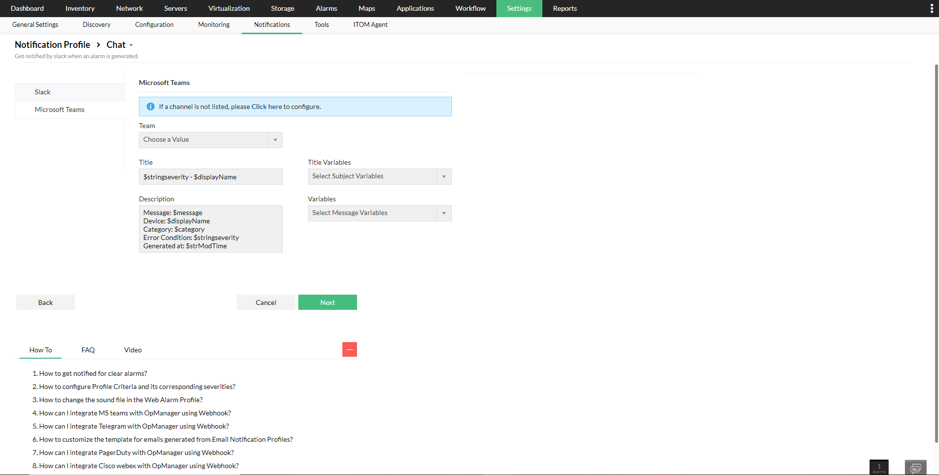 OpManager - Microsoft Teams集成现已成功。现在,满足上述通知配置文件条件的所有告警将最早发送到相关通道。