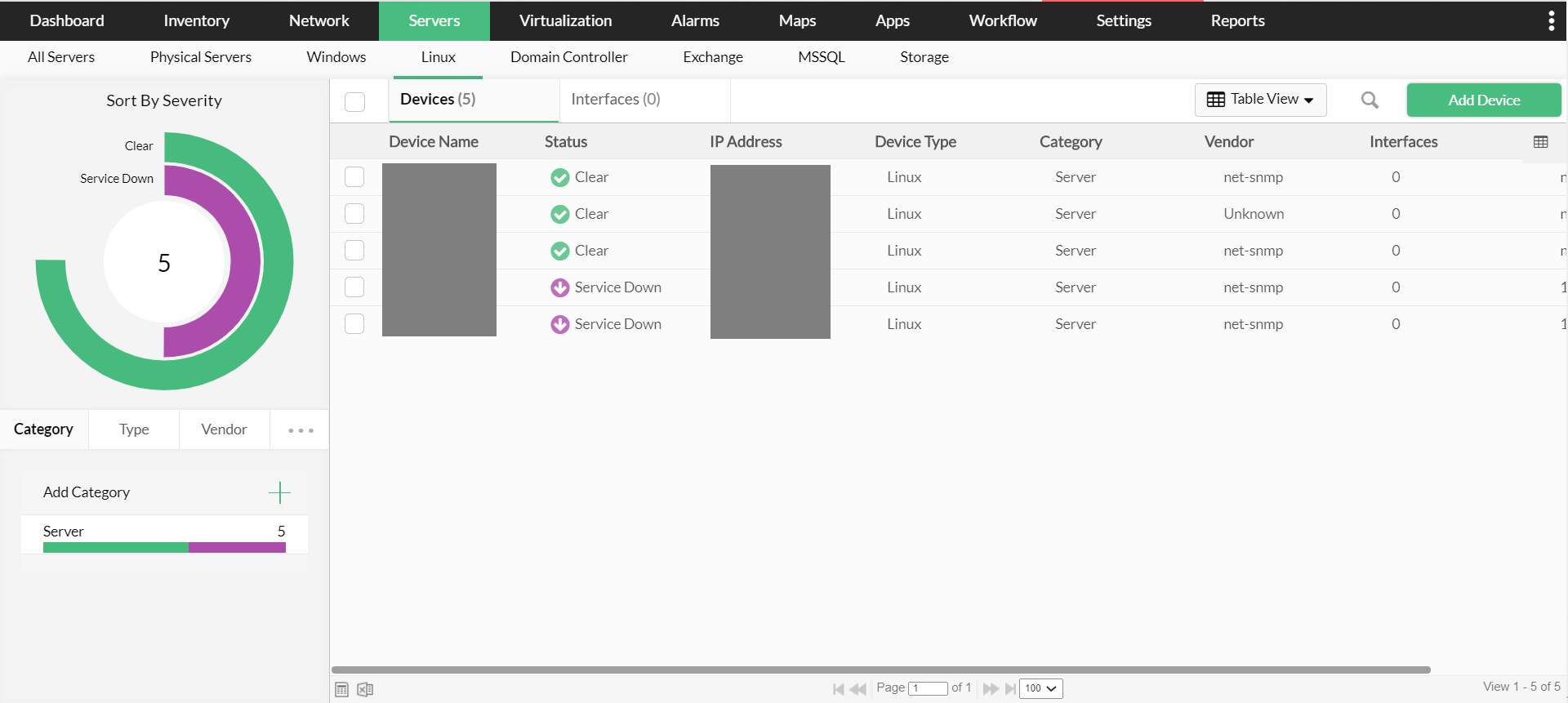 OpManager维护所有Linux服务器的清单。如果需要查看清单,只需进入服务器 > Linux。在此页面将显示服务器状态、IP地址、接口以及所有可用Linux服务器的更多详细信息。