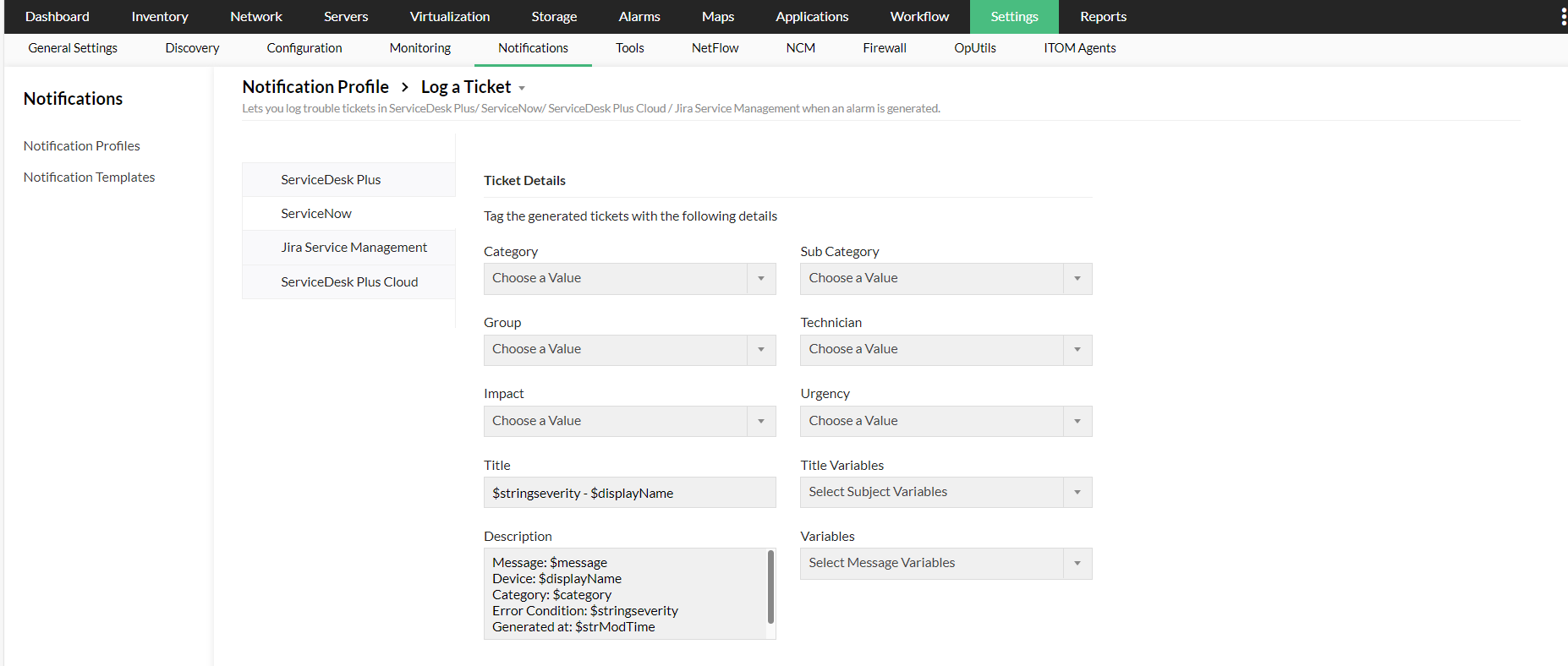 在OPManager中配置"记录工单"配置文件,进入设置 -> 通知 -> 添加配置文件 -> 记录工单。