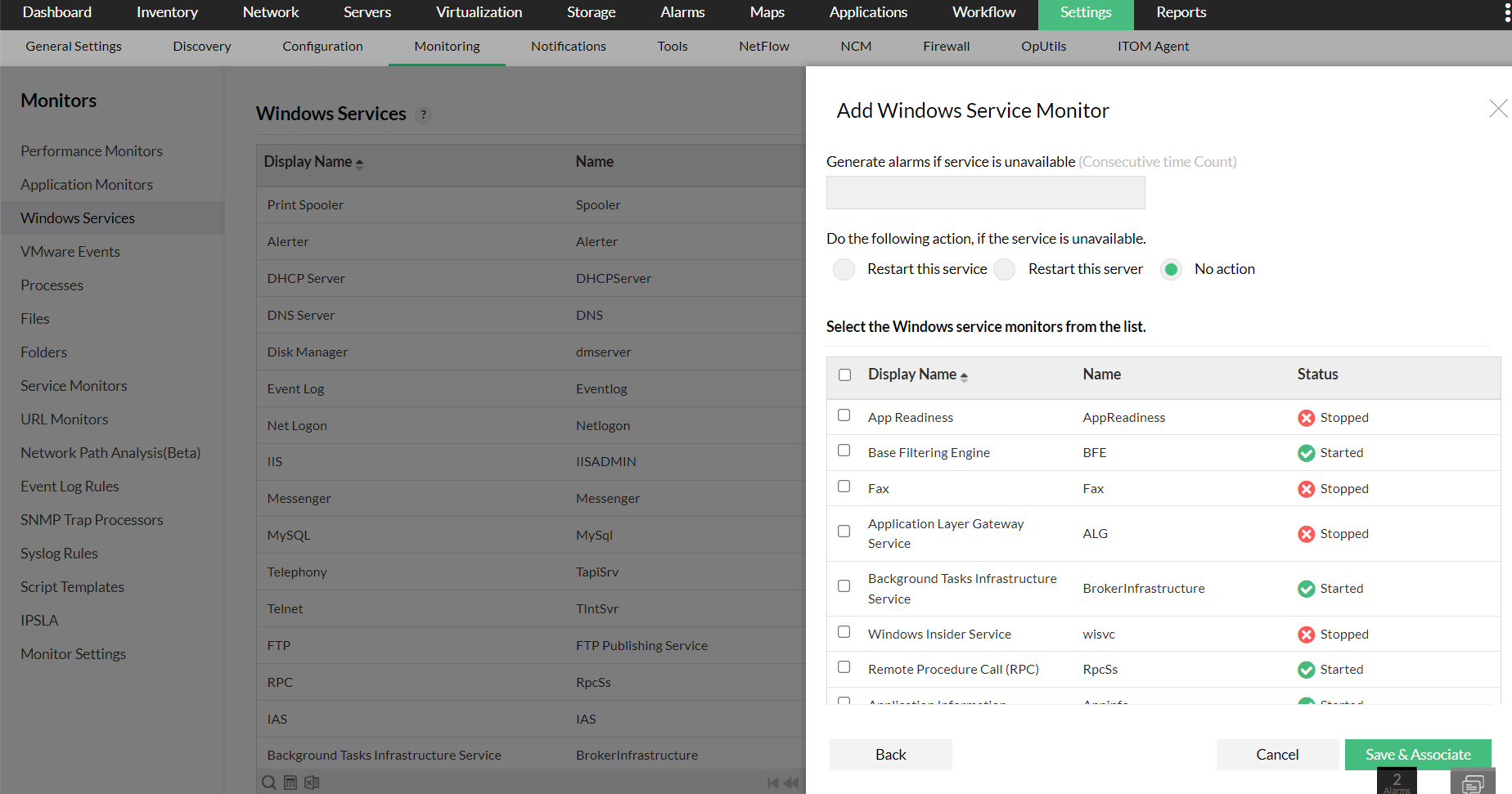 - 您也可以从设置 → 配置 → 快速配置向导 → 服务监视器选择并选择“关联Windows服务”图标执行相同的操作。