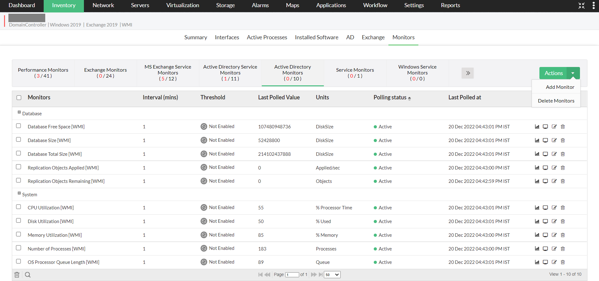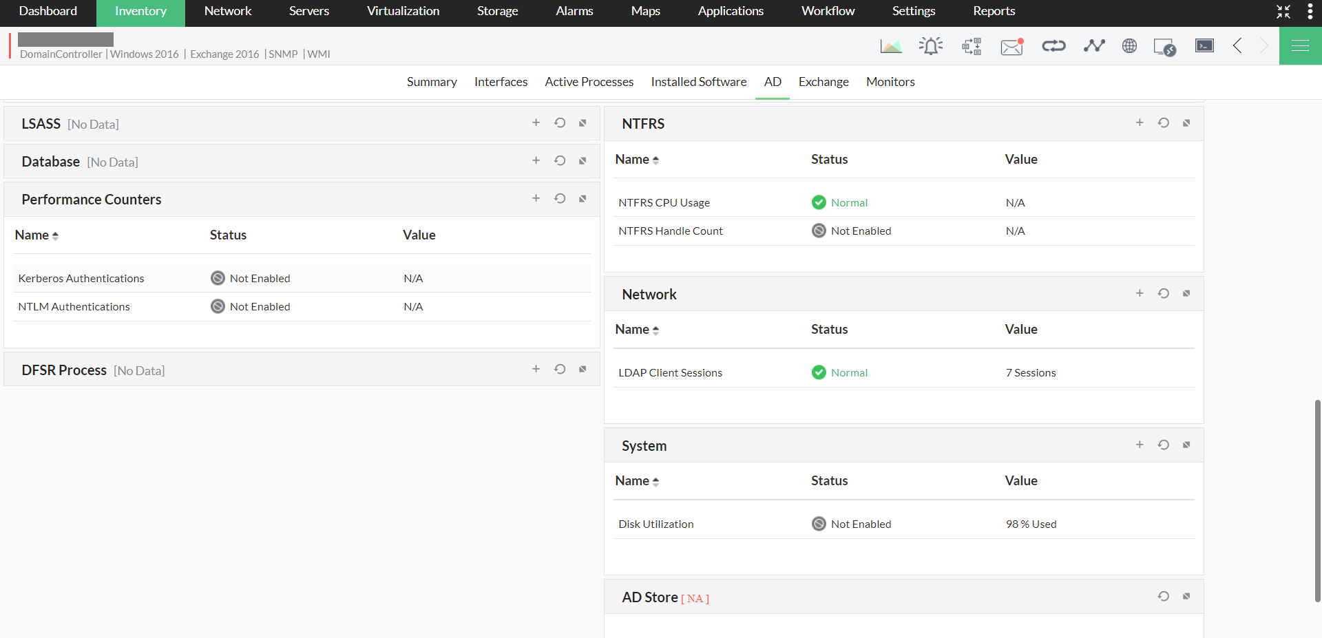为了使AD监控更加简单和方便,我们将域控制器单独分类在“基础架构视图”下。启用SNMP后,将自动将设备划分为域控制器。通过WMI对设备的系统资源和AD业务进行监控。请注意,用户可以使用WMI所需的权限监视AD服务,而不需要任何单独的权限。