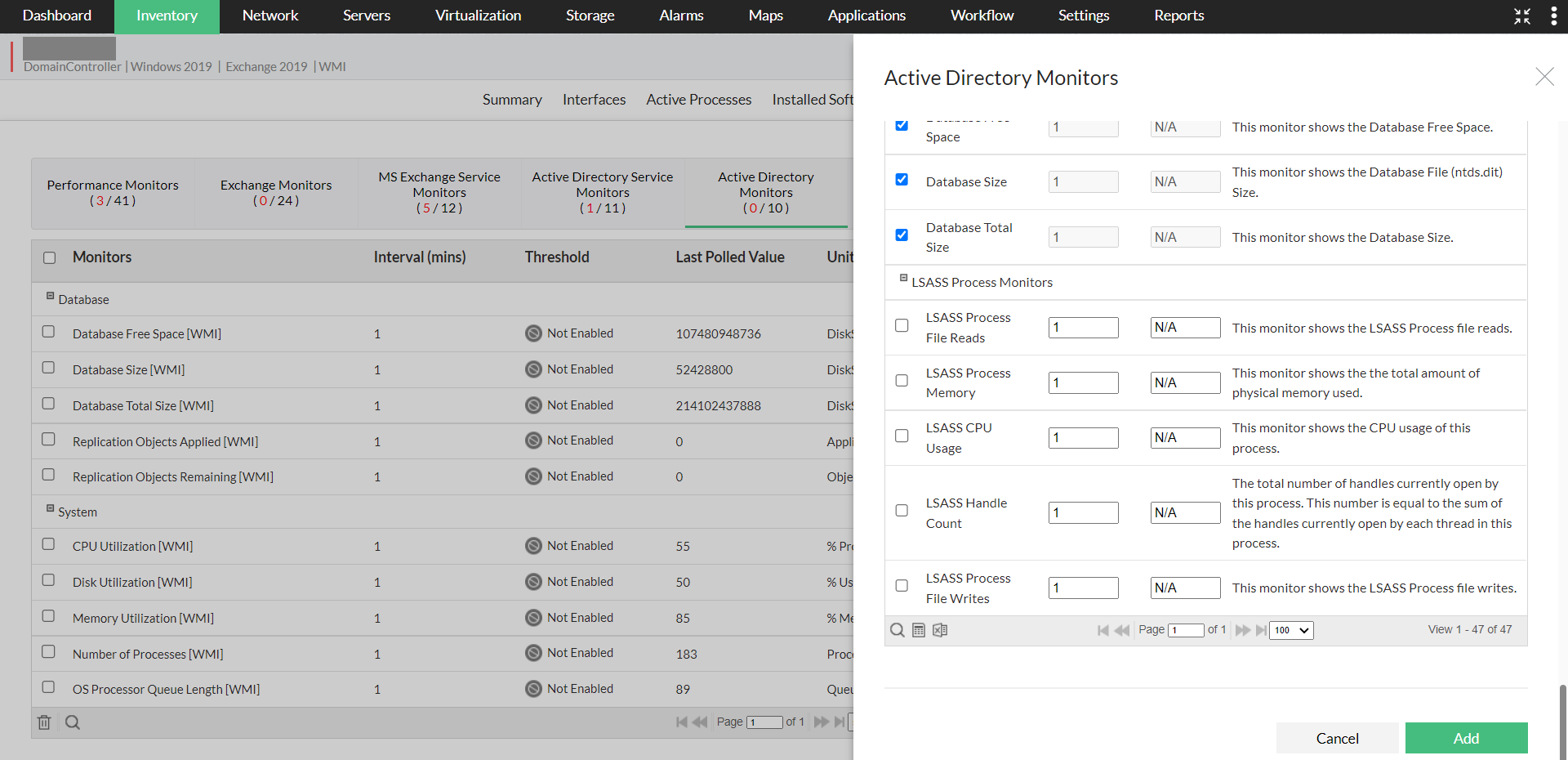 - 在 "Active Directory" 下方, 选择要关联的监视器,也可以修改相应列下的监视间隔和阈值;