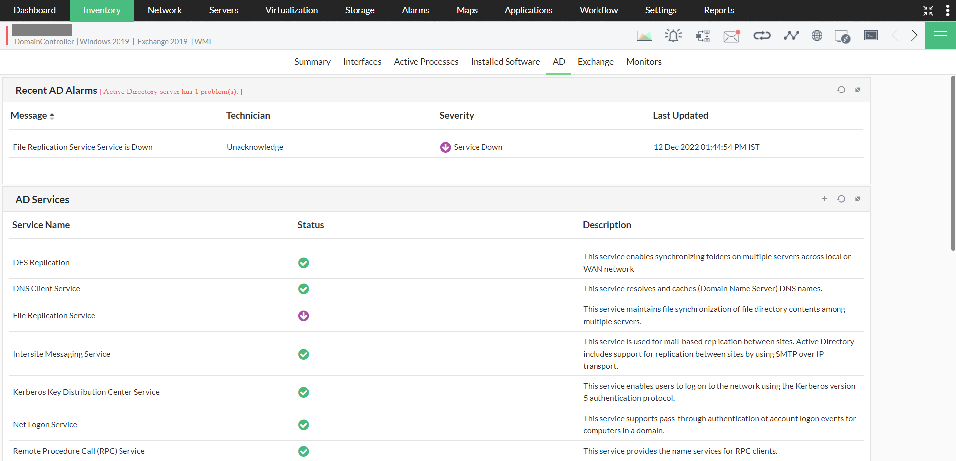 在 "AD" 选项卡中的 "设备快照" 页面,用户可以看到与Active Directory监视有关的所有数据。此选项卡作为仪表板,可以在其中了解最近的告警,正在监控的AD服务、AD服务的状态等。