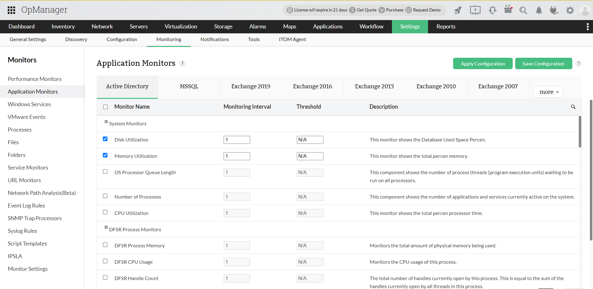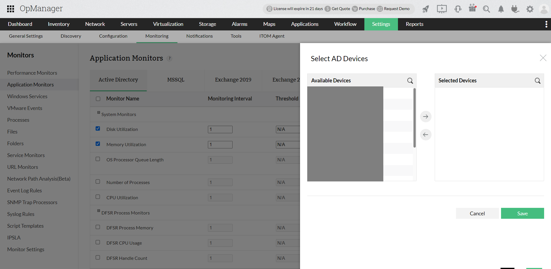 - 要一次将监视器关联到多个设备,请导航到 "设置 -> 监控 -> 应用系统监控";