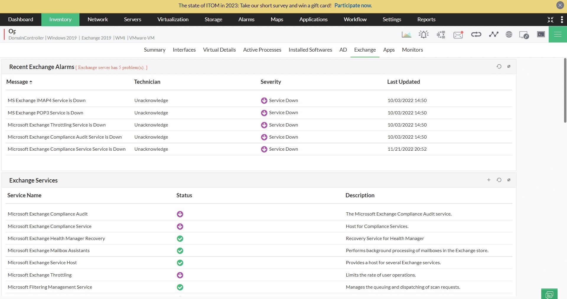 与Exchange服务器监控相关的所有数据都在设备快照页面中提供的Exchange选项卡下全面给出。Exchange选项卡是一个仪表板,可以让您了解各个方面,例如最近的告警、活动Exchange服务和单个控制台中关联的监视器。
