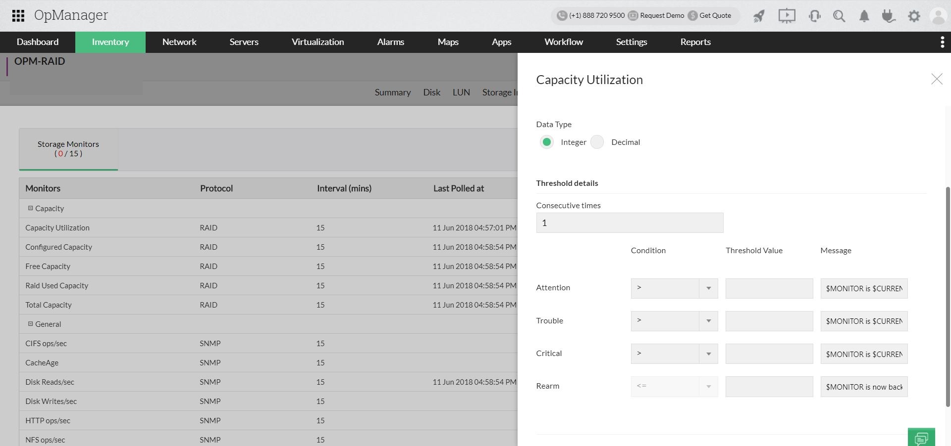 此外,对于与设备关联的每个监视器(例如:CPU Utilization),您可以配置阈值级别。所以无论何时,值超过给定阈值水平的指定值, OpManager都会发出告警。例如,当设备违反需要关注的阈值级别时, OpManager会发出注意级别的告警,您可以在设备达到下一个级别之前采取纠正措施。