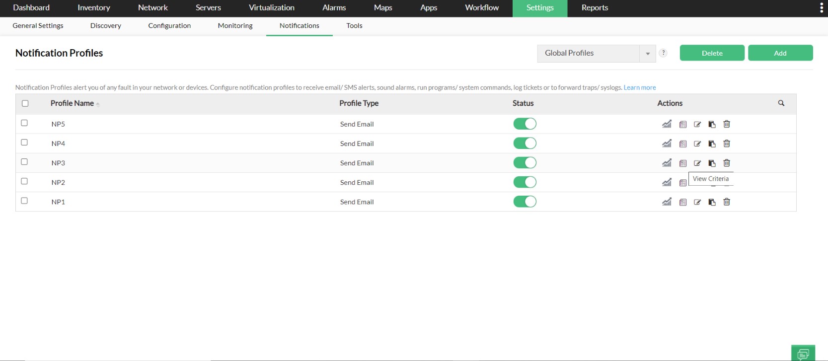 当网络检测到故障时,发生一个事件并且多个事件相互关联以触发告警。通过通知配置文件,OpManager可以根据设备产生的告警通知网络管理员或自动执行相应的操作。