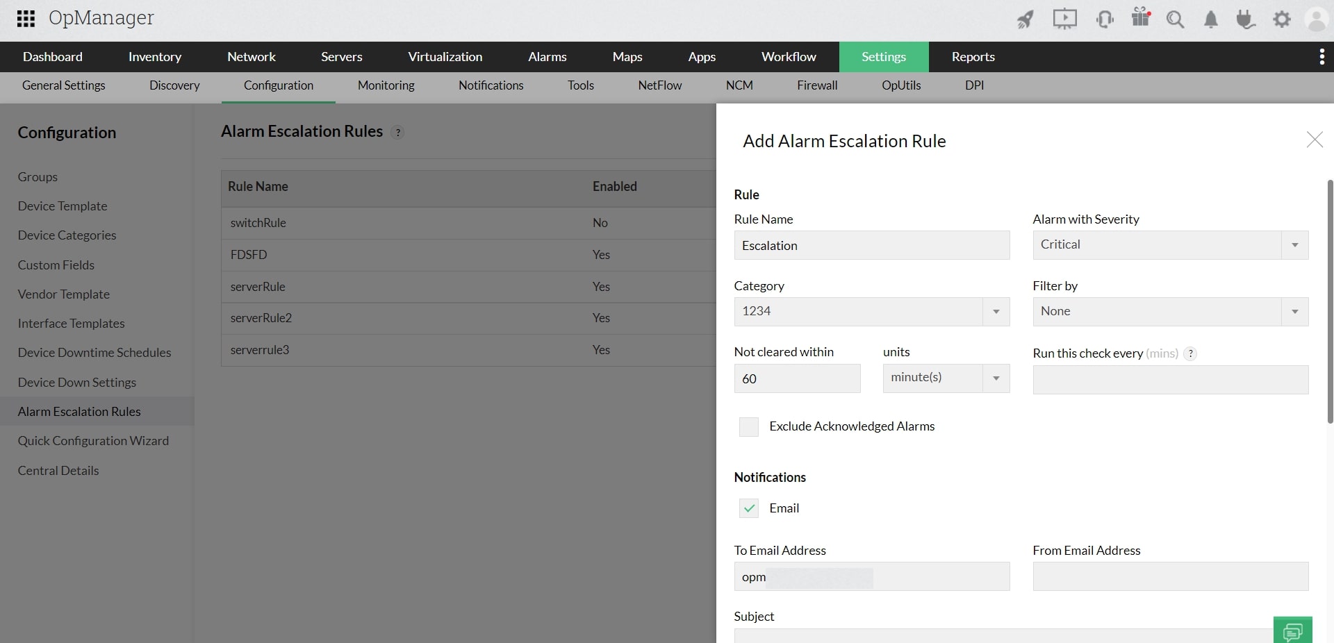 用户可以通过配置告警升级规则,将告警升级到高级负责人或备份IT管理员,确保问题在升级为网络/设备故障之前得到解决。可以配置告警的级别和上报的最大持续时间。