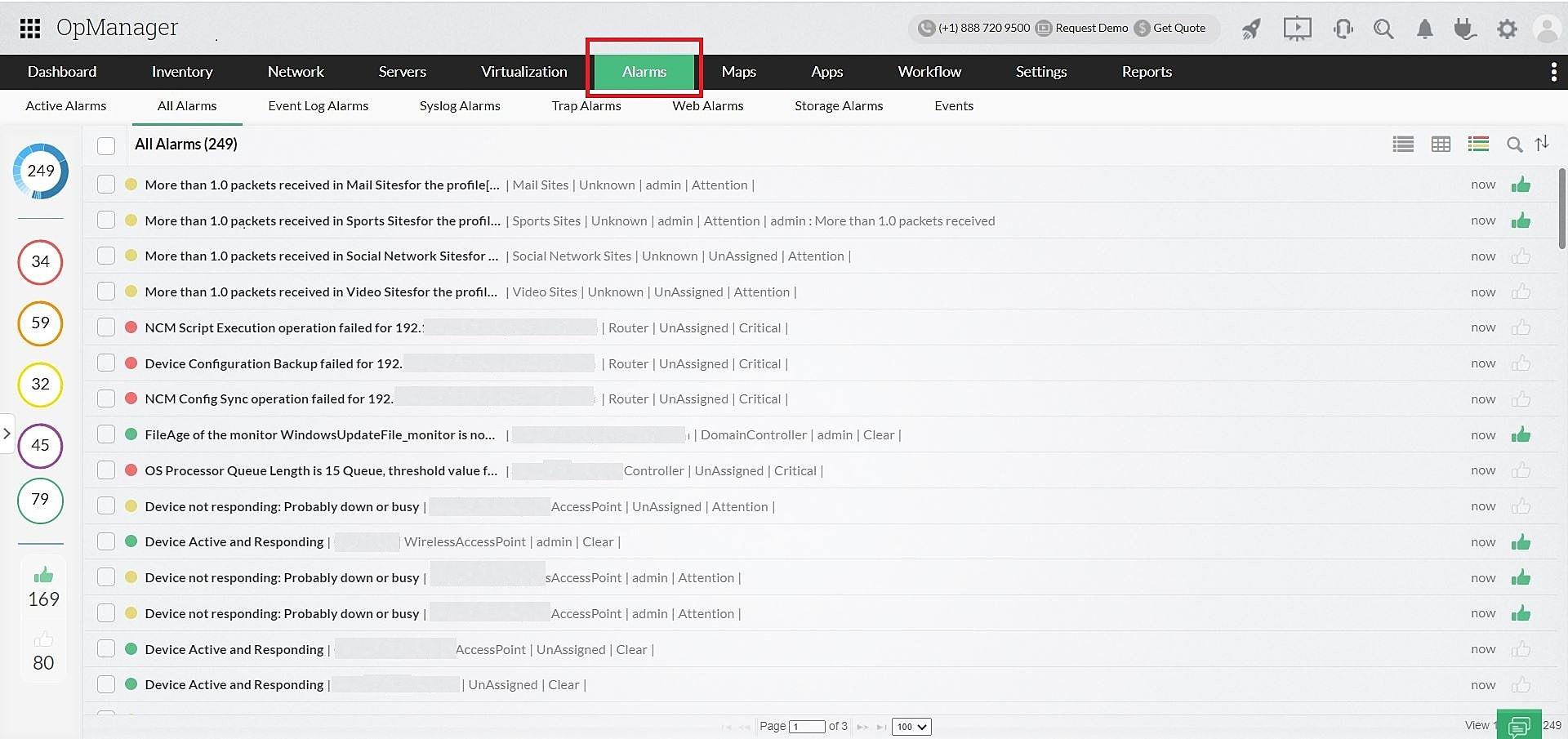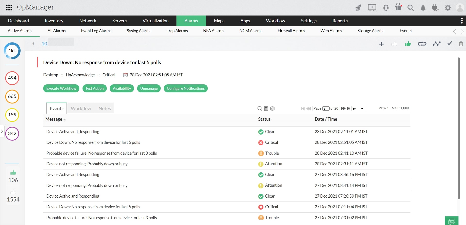 OpManager对网络中的设备和接口进行监控,当网络出现响应慢、连通性丢失、丢包等异常时,通过告警方式通知用户。也就是说,当任何设备或接口没有达到最佳状态时,都会立即产生告警。