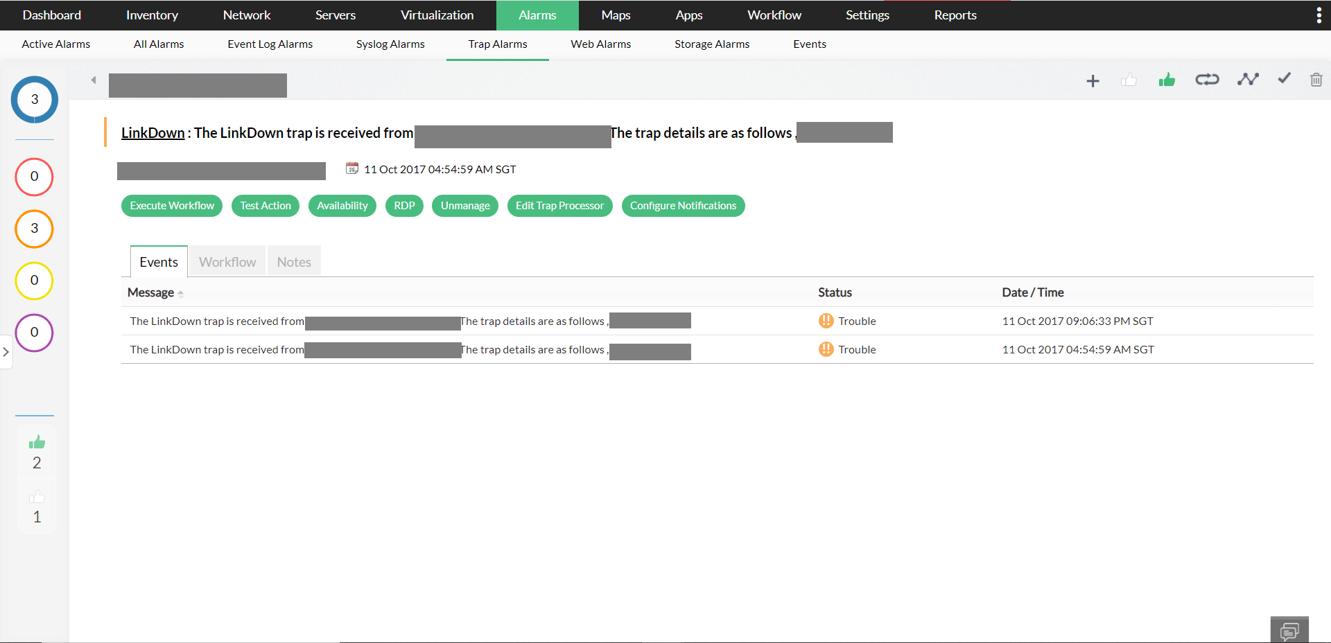 OpManager的SNMP陷阱监视器侦听来自默认端口162上的设备的SNMP陷阱。因此,它会自动充当陷阱接收器,并基于OpManager中定义的陷阱处理器,对陷阱进行处理并显示为OpManager告警。当默认端口 162 被阻止时,陷阱端口可以切换到其他端口。