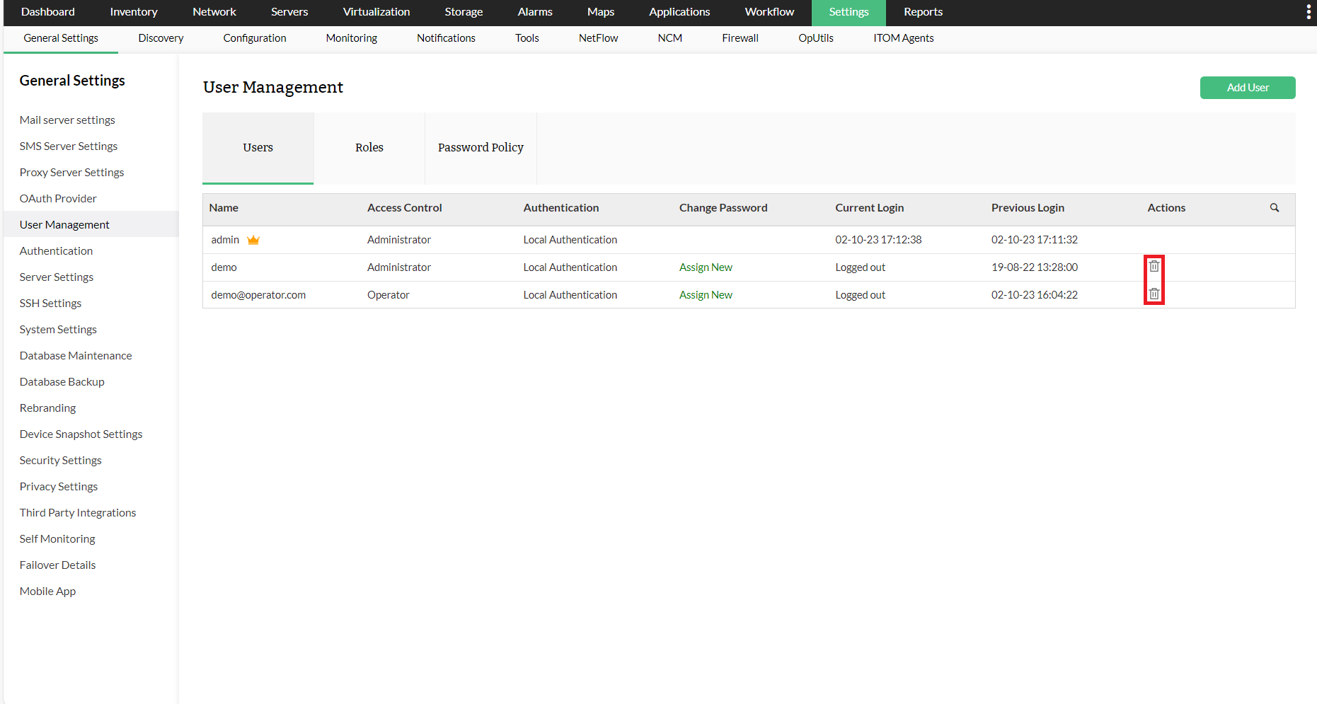 在OpManager中,可以使用管理员帐户或具有权限的帐户添加和删除用户。按照以下步骤从OpManager中删除用户。