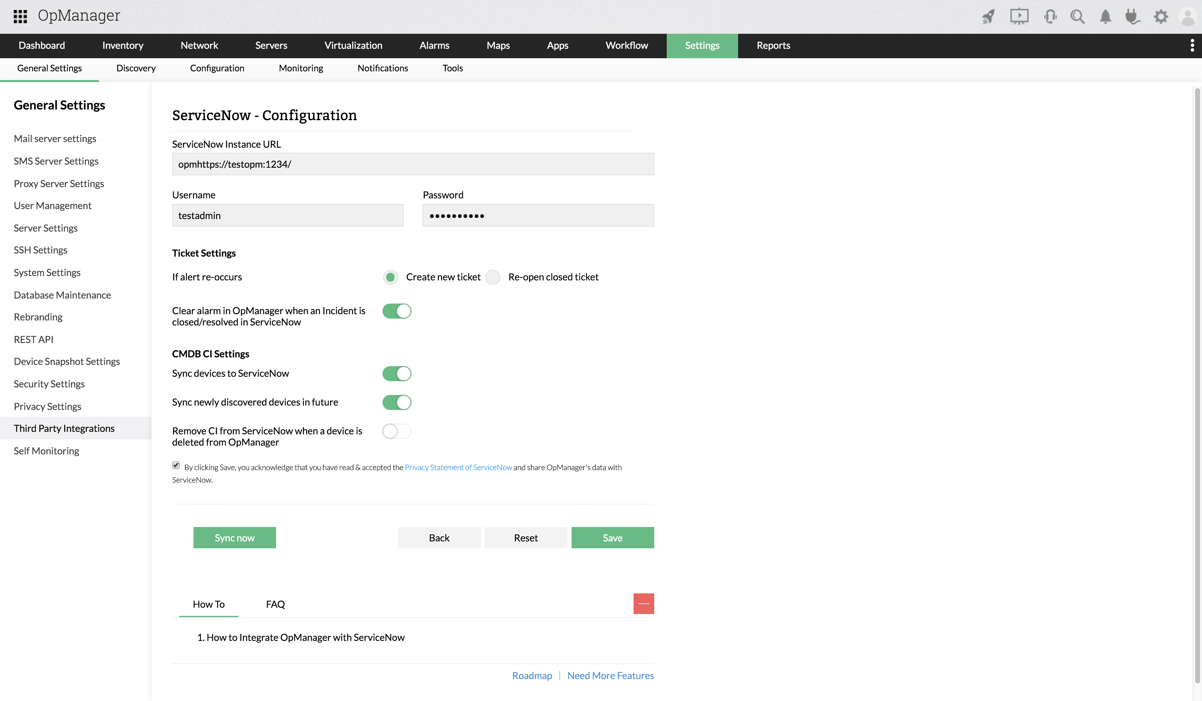 - 在OpManager中,转到ServiceNow→设置→常规设置→第三方集成,然后单击配置。