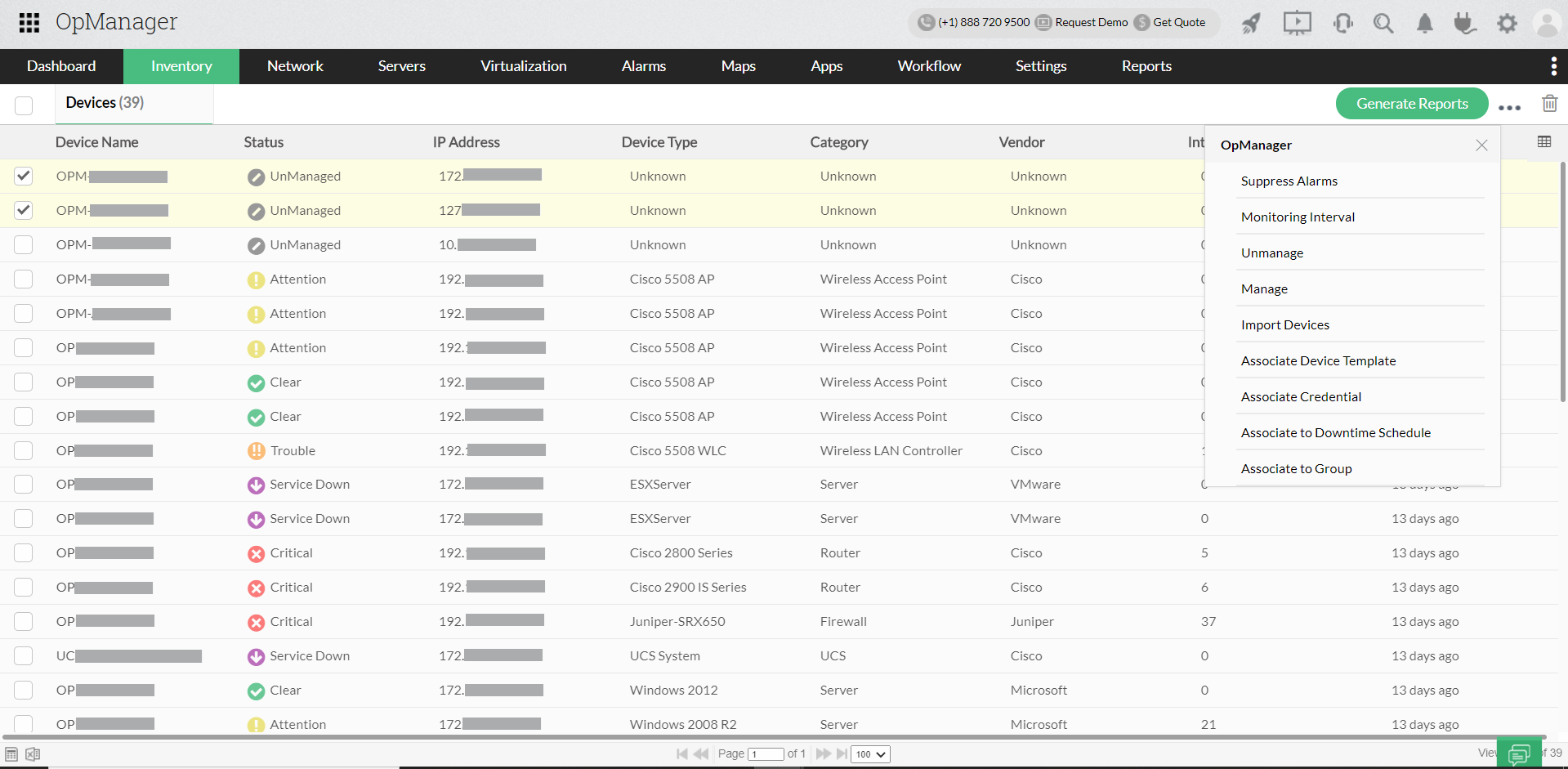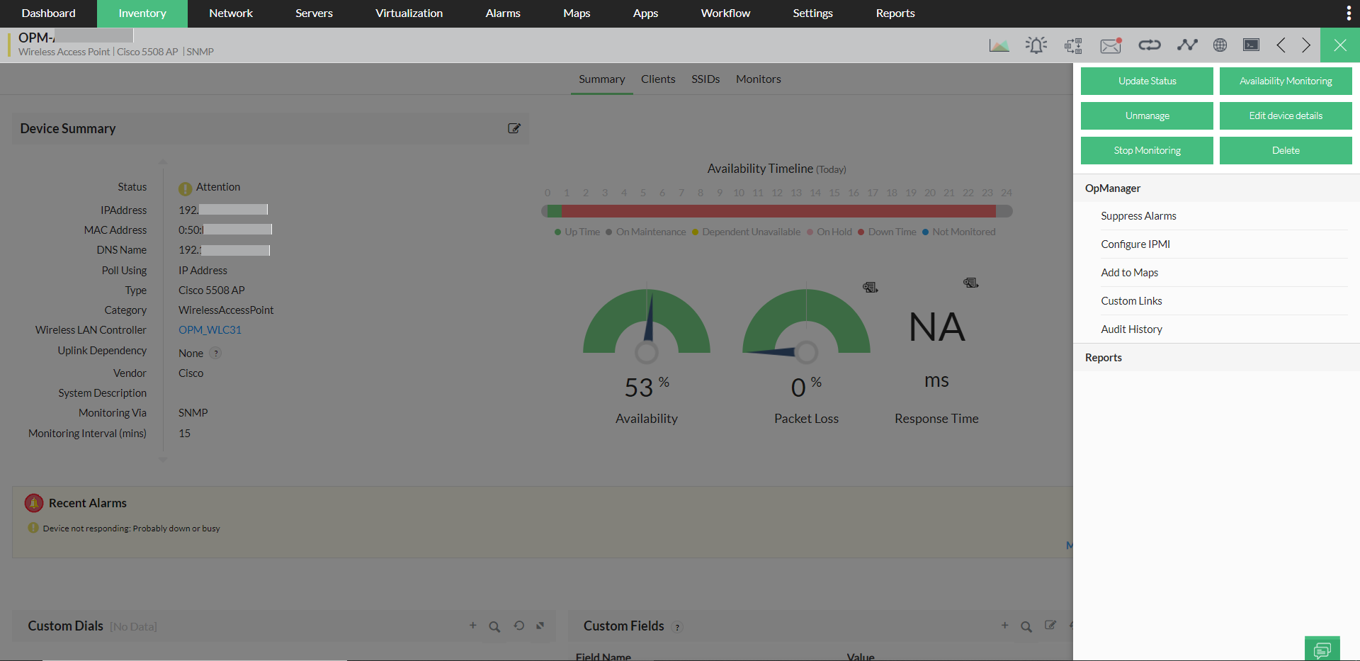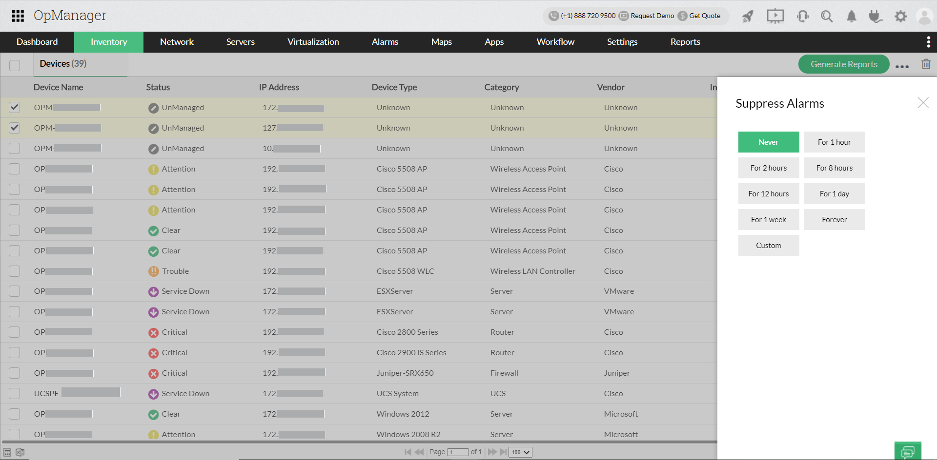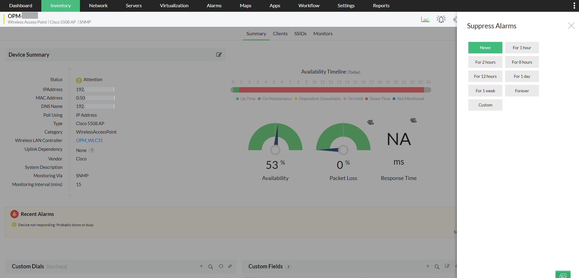 OpManager为您提供了在预定义的时间间隔内抑制设备告警的选项。在设备正在维护或设备存在一些已知问题的情况下,此选项将非常有用。