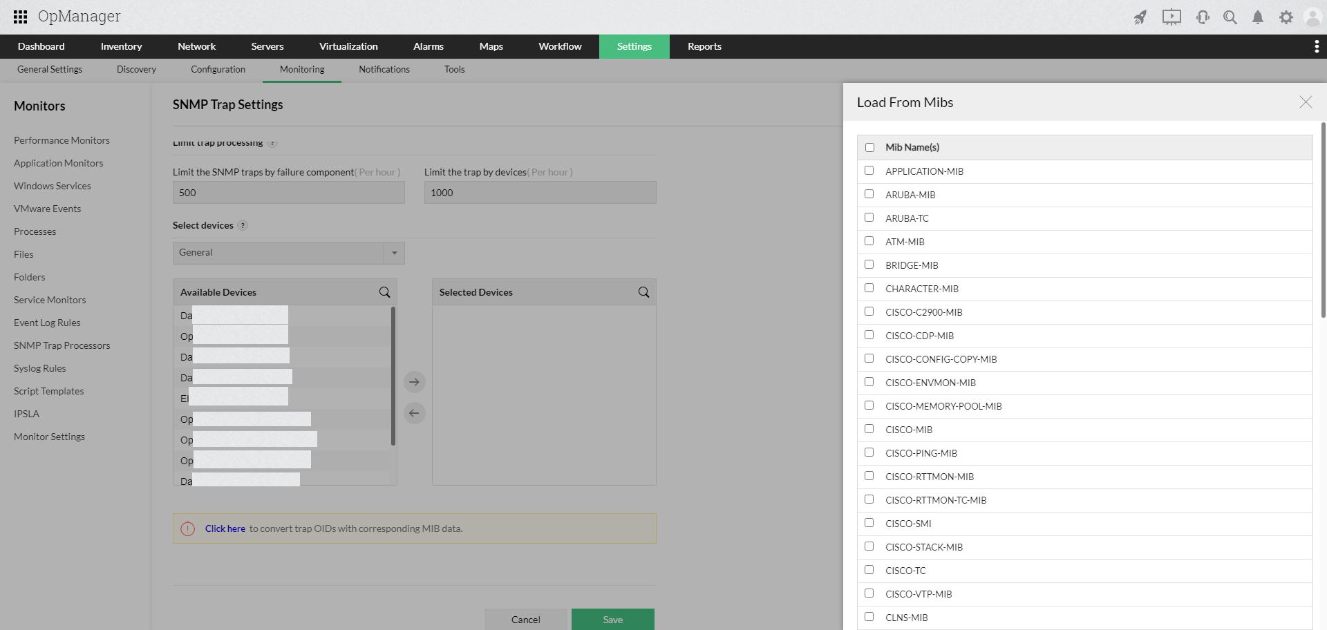 设备中的SNMP管理器发送陷阱,其中包含根据MIB中的信息生成的varbinds(OID值对)。要在OpManager中将变量转换为可量化值,用户必须选择相关的MIB文件。