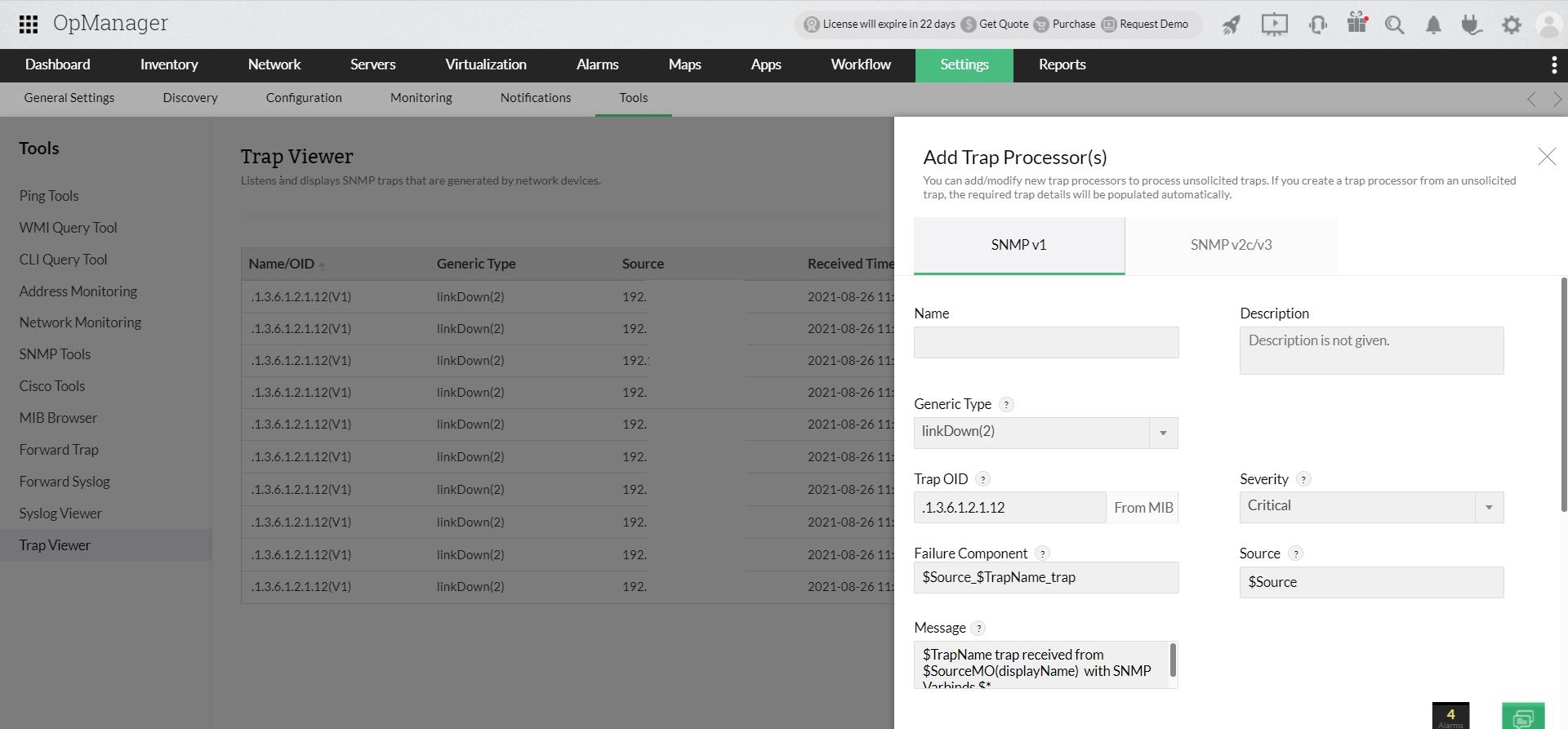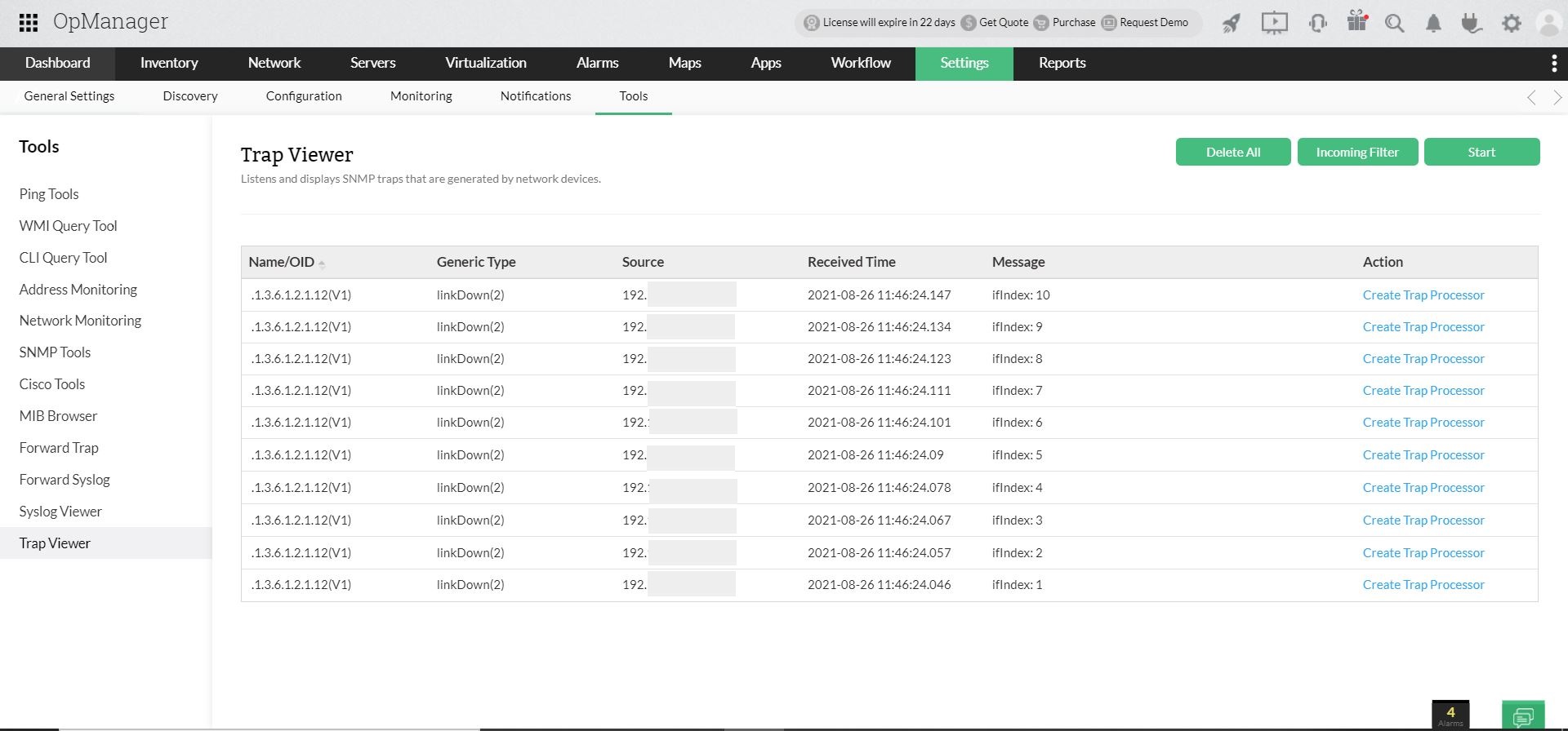 - 导航到 设置 --> 监控 --> SNMP 陷阱处理器。(或)设置->工具->Trap 查看器。(或) 告警->陷阱告警->陷阱查看器