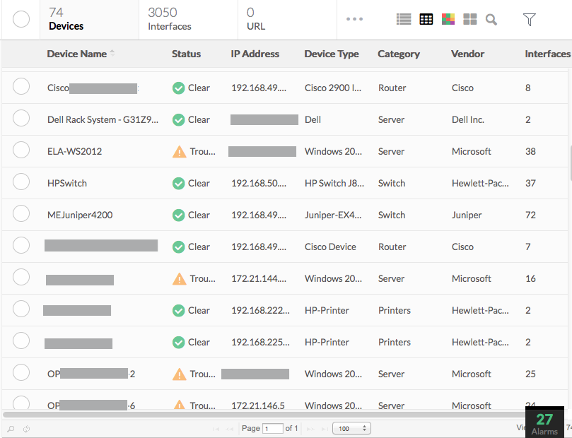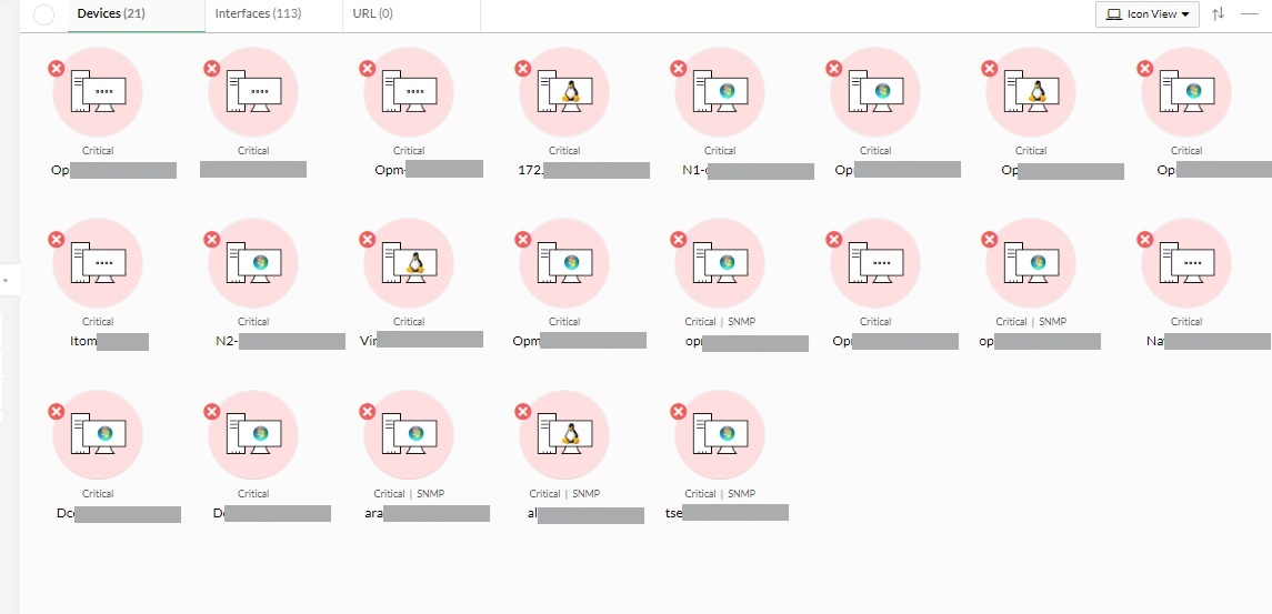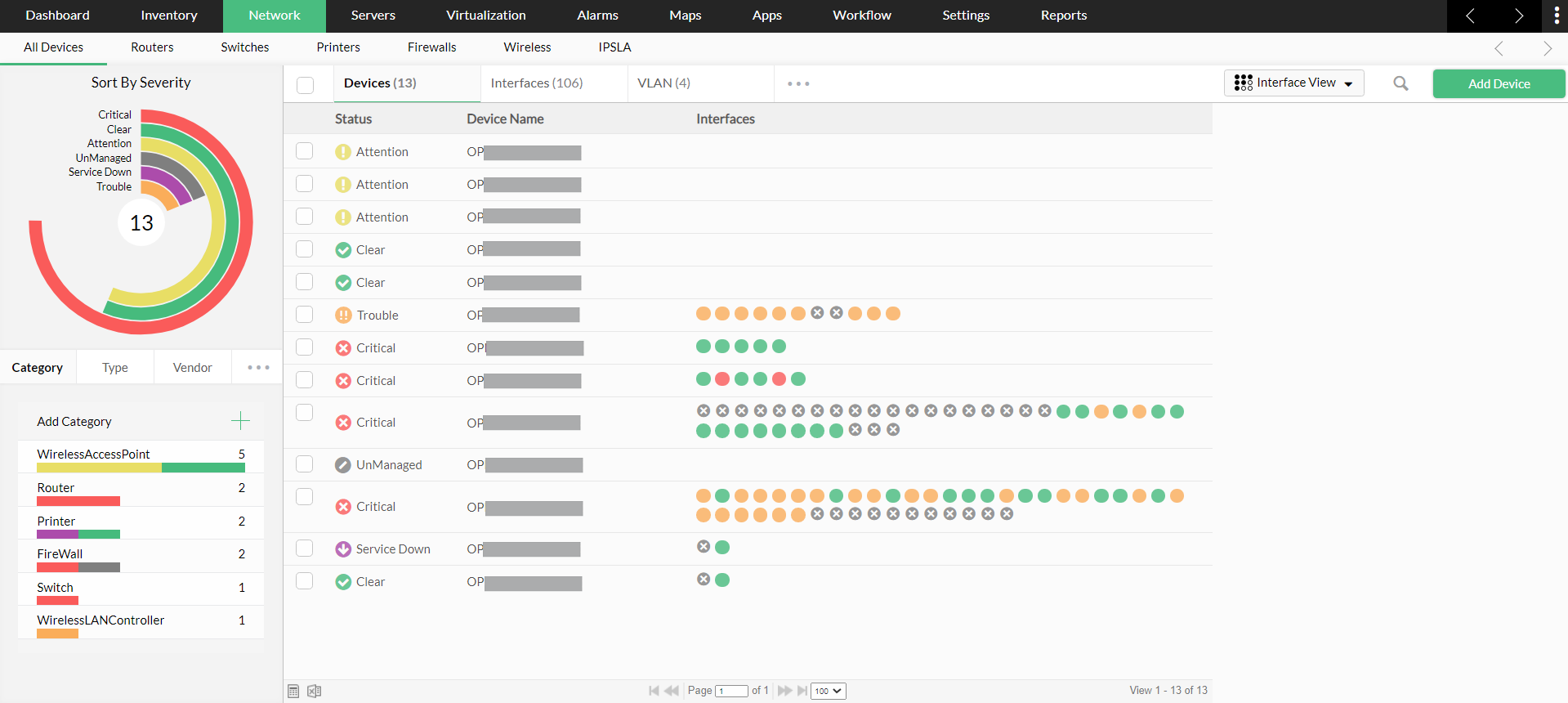 此视图类似于清单的视图。您可以找到设备名称、可用性状态、关联的接口、类型、供应商等详细信息。